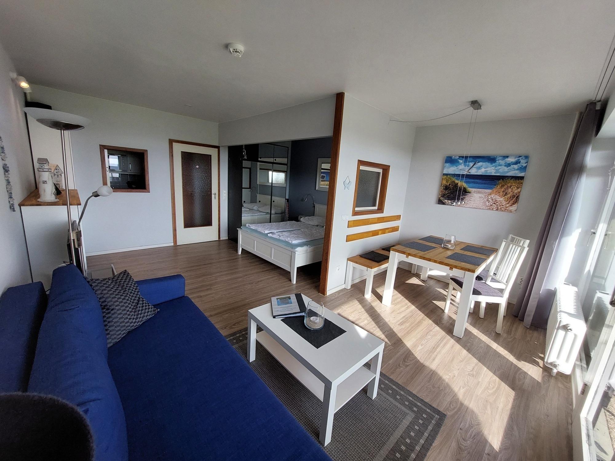 Unsere schön helle, freundliche Einzimmerwohnung ist 39m², liegt im Erdgeschoss mit Südterrasse und einem bildschönen Bild auf die Ostsee.