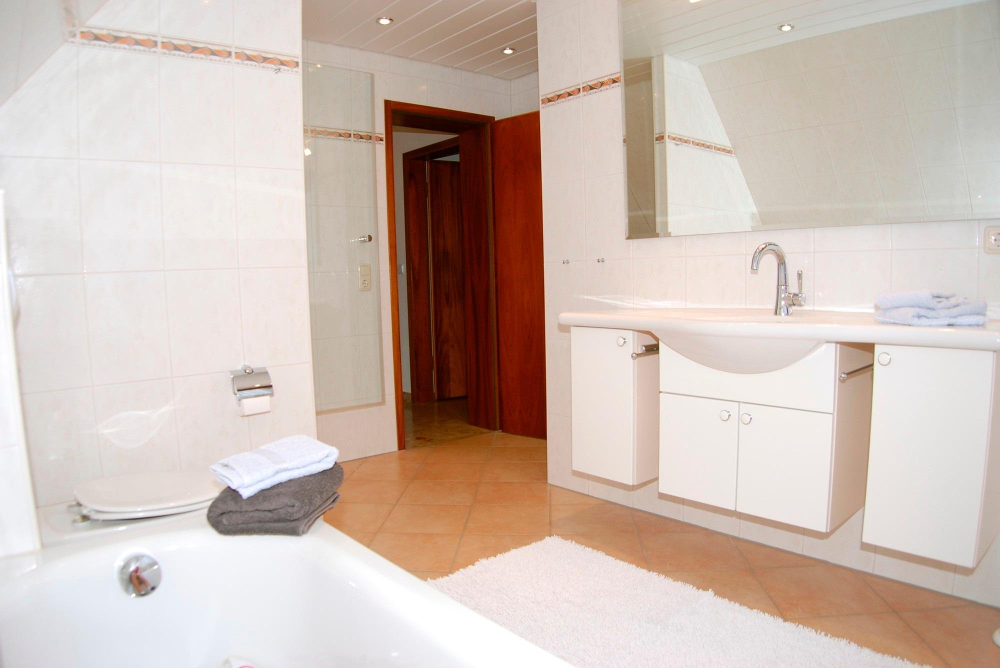 Das Badezimmer ist sehr geräumig mit Badewanne und Dusche.