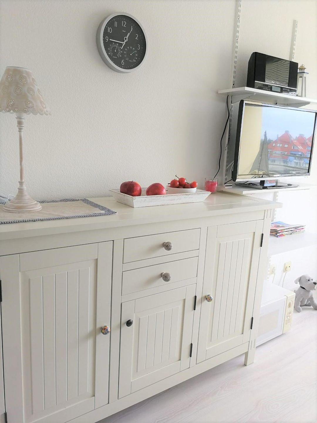 Der Wohn-/ Essraum ist hell- und freundlich eingerichtet und lädt mit seiner bequemen Polsterecke und dem großen Fernseher (80cm-Diagonale) zu entspannten Urlaubsmomenten ein. Das Radio verfügt über einen USB-Anschluss und die Möglichkeit, CDs zu hören In der Kommode sind Gläser und Geschirr untergebracht, sowie auch einige Elektro-Kleingeräte, die in den Küchenschränken keinen Platz gefunden haben.