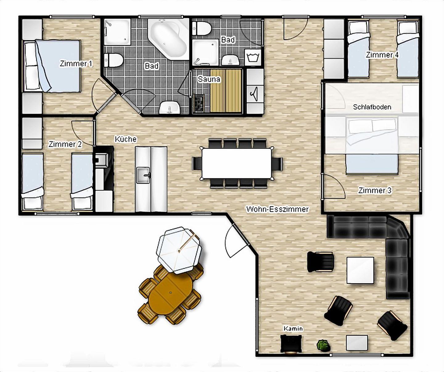 Auf ca. 100 qm Wohnfläche finden Sie jede Menge Platz für bis zu 12 Personen - davon sind vier Schlafmöglichkeiten nur für Kinder vorgesehen.