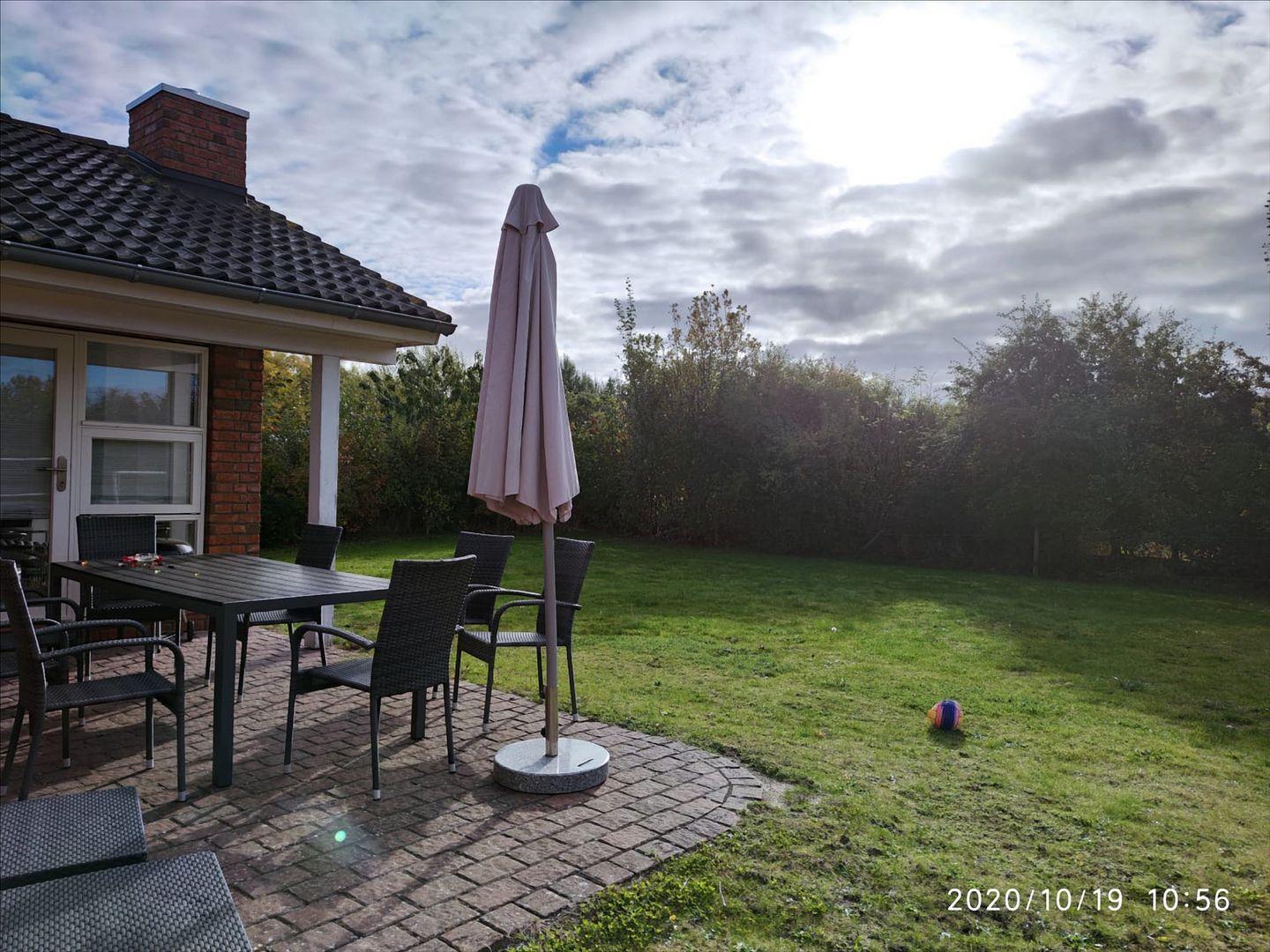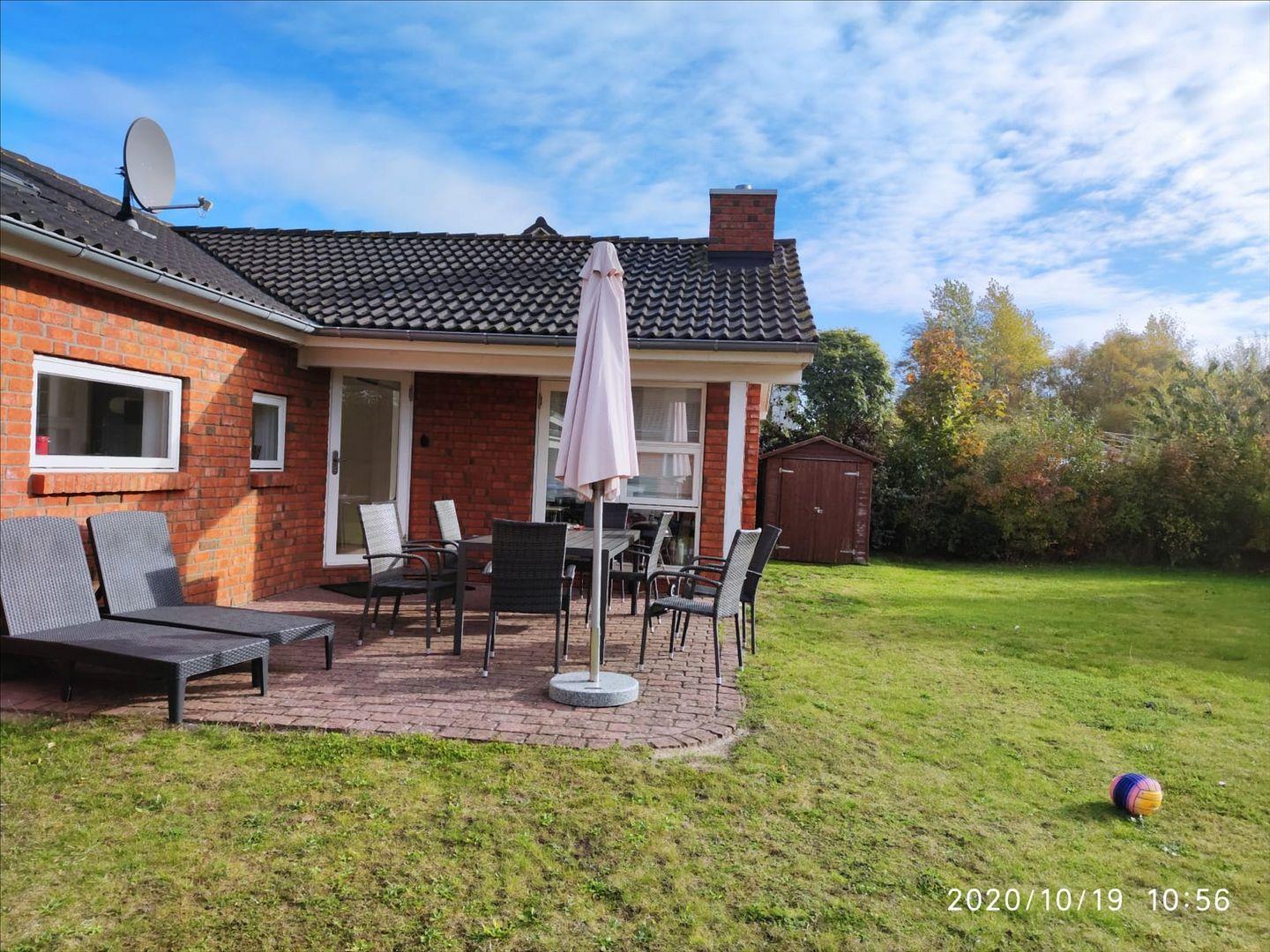 Auf der großen Südterrasse mit Sonnenliegen, Barbecue-Grill, Sonnenschirm und großem Esstisch genießen Sie auf dem 350 qm großen eigenen Rasen-Grundstück eine entspannte Zeit bei schönem Wetter.