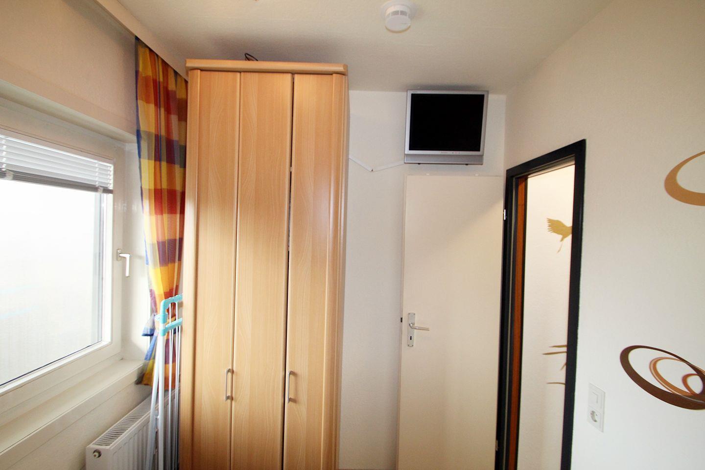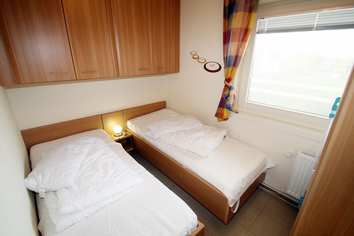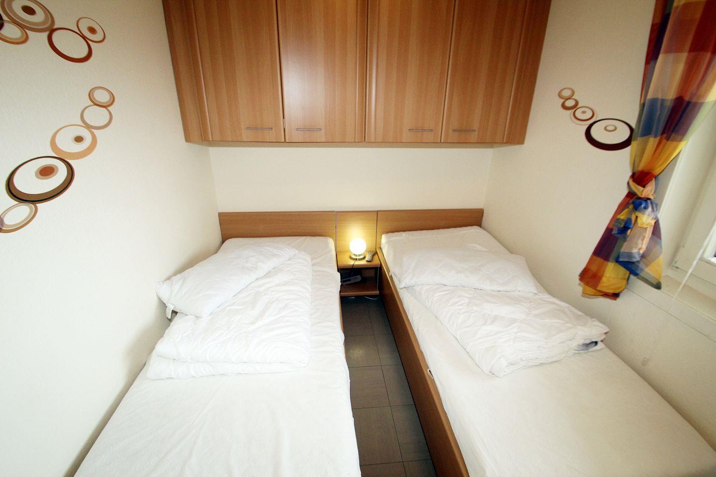 Im separaten Schlafzimmer sorgen zwei Einzelbetten (je 80*190 cm) mit offenem Fußende für eine angenehme Nacht. Das Fenster ist mit einer Jalousie zum Verdunkeln sowie einem Fliegengitter versehen. Über den Betten sorgen weitere Schränke zusätzlich zum Kleiderschrank für genügend Verstaungsmöglichkeiten Ihres Kofferinhaltes - auch für längere Aufenthalte.