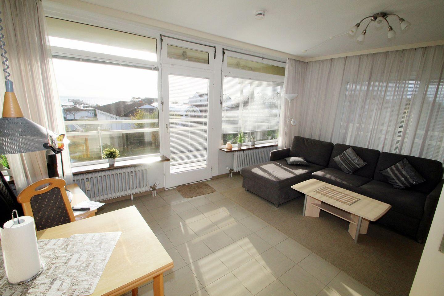 Ihre Ferienwohnung 32 im Haus Belvedere liegt im 2. Stock des Hauses und lässt Sie von der großzügigen Fensterfront über Eck den Blick auf das Meer genießen.