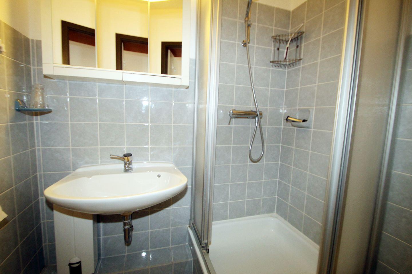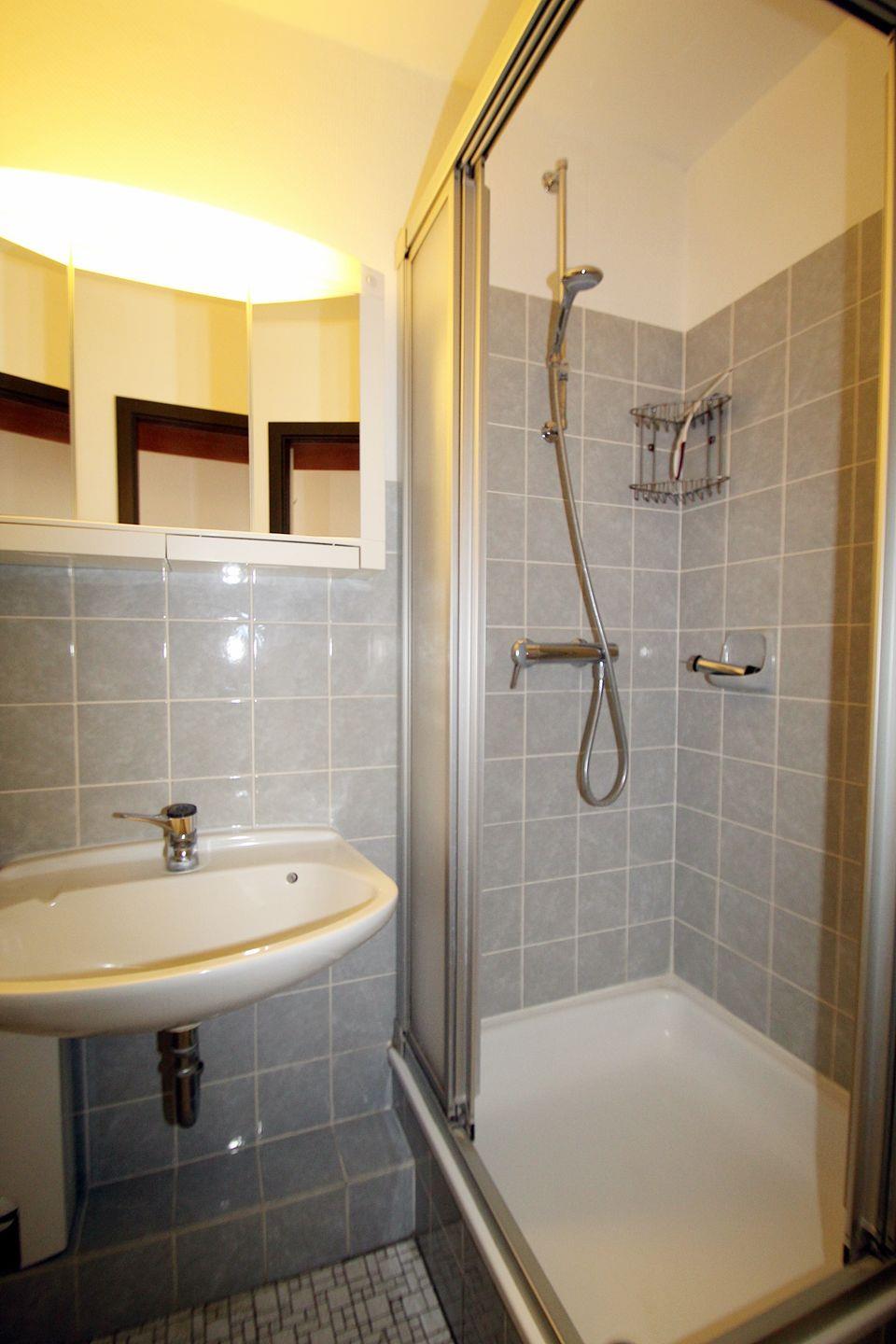 Das kleine, innenliegenden Duschbad ist zweckmäßig mit Duschkabine und beleuchtetem Spiegelschrank ausgestattet.