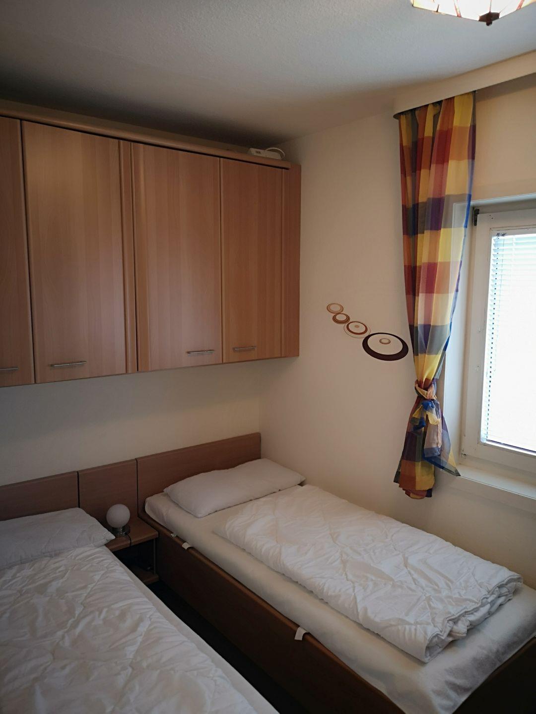 Im separaten Schlafzimmer sorgen zwei Einzelbetten (je 80*190 cm) mit offenem Fußende für eine angenehme Nacht. Das Fenster ist mit einer Jalousie zum Verdunkeln sowie einem Fliegengitter versehen. Über den Betten sorgen weitere Schränke zusätzlich zum Kleiderschrank für genügend Verstaumöglichkeiten Ihres Kofferinhaltes - auch für längere Aufenthalte.