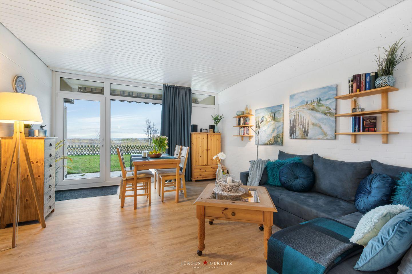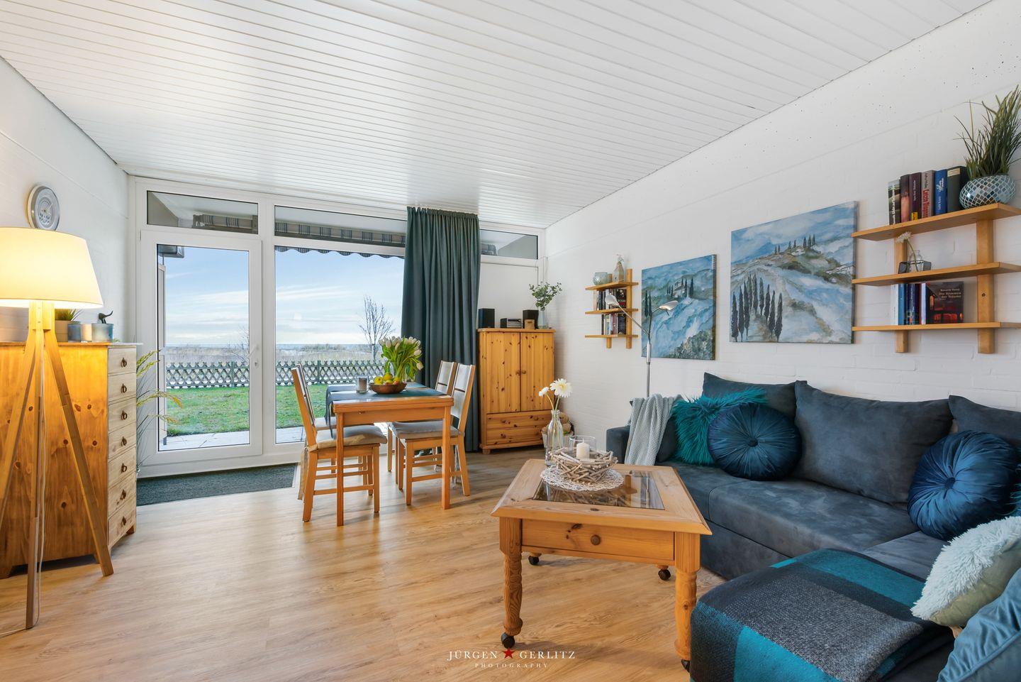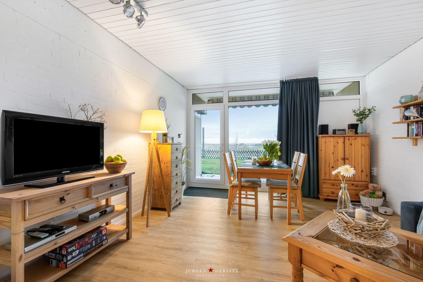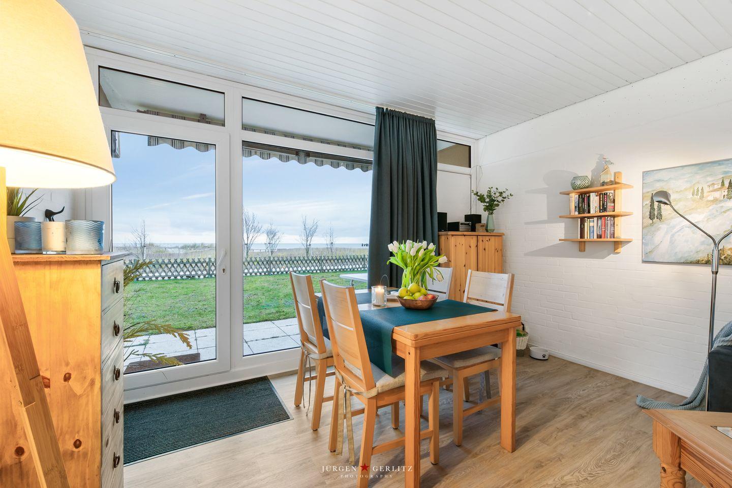 Die überdachte und möblierte Terrasse lässt Sie von morgens bis spät nachmittags die Sonne genießen. Von hier ist es nur ein Steinwurf zum feinsandigen Strandsand hinter den 2020 neu angelegten Dünen. Eine gepflegte Rasenfläche trennt Ihre Terrasse von der neuen Promenade die mit Holzstegen durch die Dünen und drehbaren Sonnenliegen auf den Aussichtsplattformen begeistert. Strandkorbvermieter und Gastronomie sind keine 300 Meter entfernt und tragen zu Ihrem entspannten Urlaub bei.