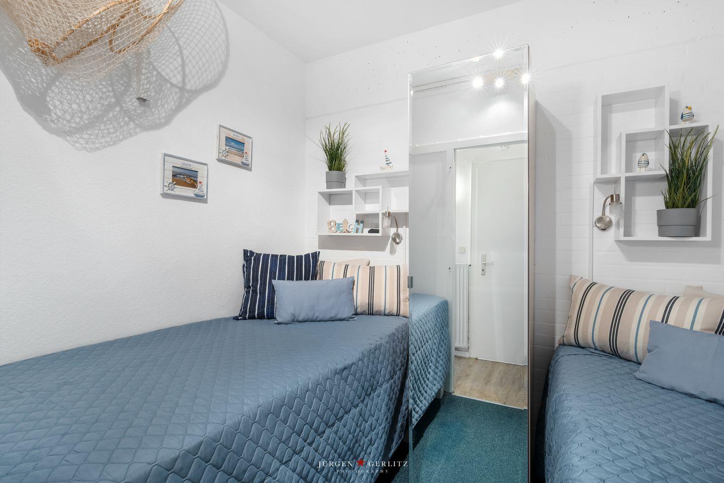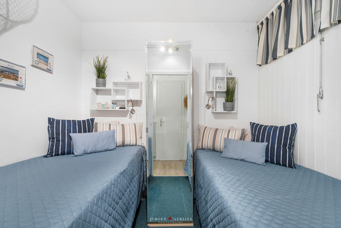 In dem maritim dekorierten Schlafraum mit zu öffnendem Oberlicht stehen Ihnen zwei Einzelbetten sowie ein Kleiderschrank mit großer Spiegeltür für gemütliche Nächte bereit.
