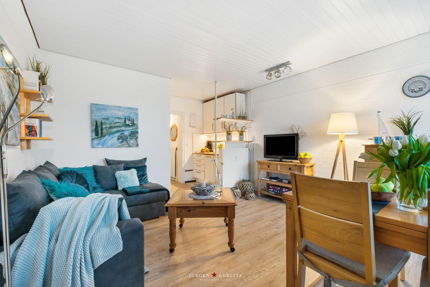Im kombinierten Wohn-/ Ess-/ und Küchenbereich wartet eine kleine, gut ausgestattete Küchenzeile mit Ceranfeld und Spüle auf ihren Einsatz.