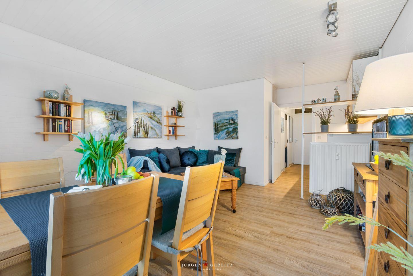 Die gemütlich-liebevoll eingerichtete Wohnung für bis zu 4 Personen empfängt Sie in einem kleinen Flur von dem das Bad und das separate Schlafzimmer abzweigen.
