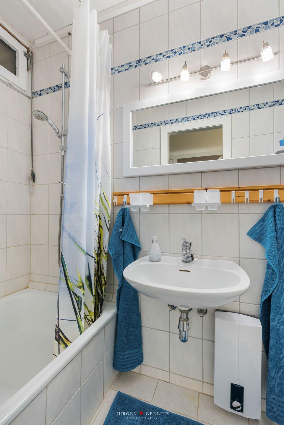 Das kleine, helle Duschbad mit tiefer Wanne und kippbarem Oberlicht wurde modern saniert.