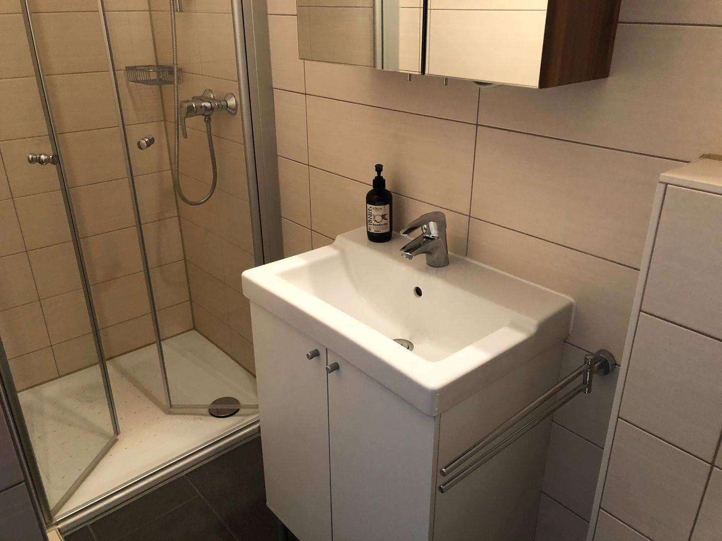 In dem liebevoll eingerichteten 2-Zimmer-Appartement im ersten Stock finden Sie ein modern saniertes, innenliegendes Duschbad mit Handtuchheizkörper, geräumiger Dusche mit Glastüren und beleuchtetem Spiegelschrank mit Steckdose.