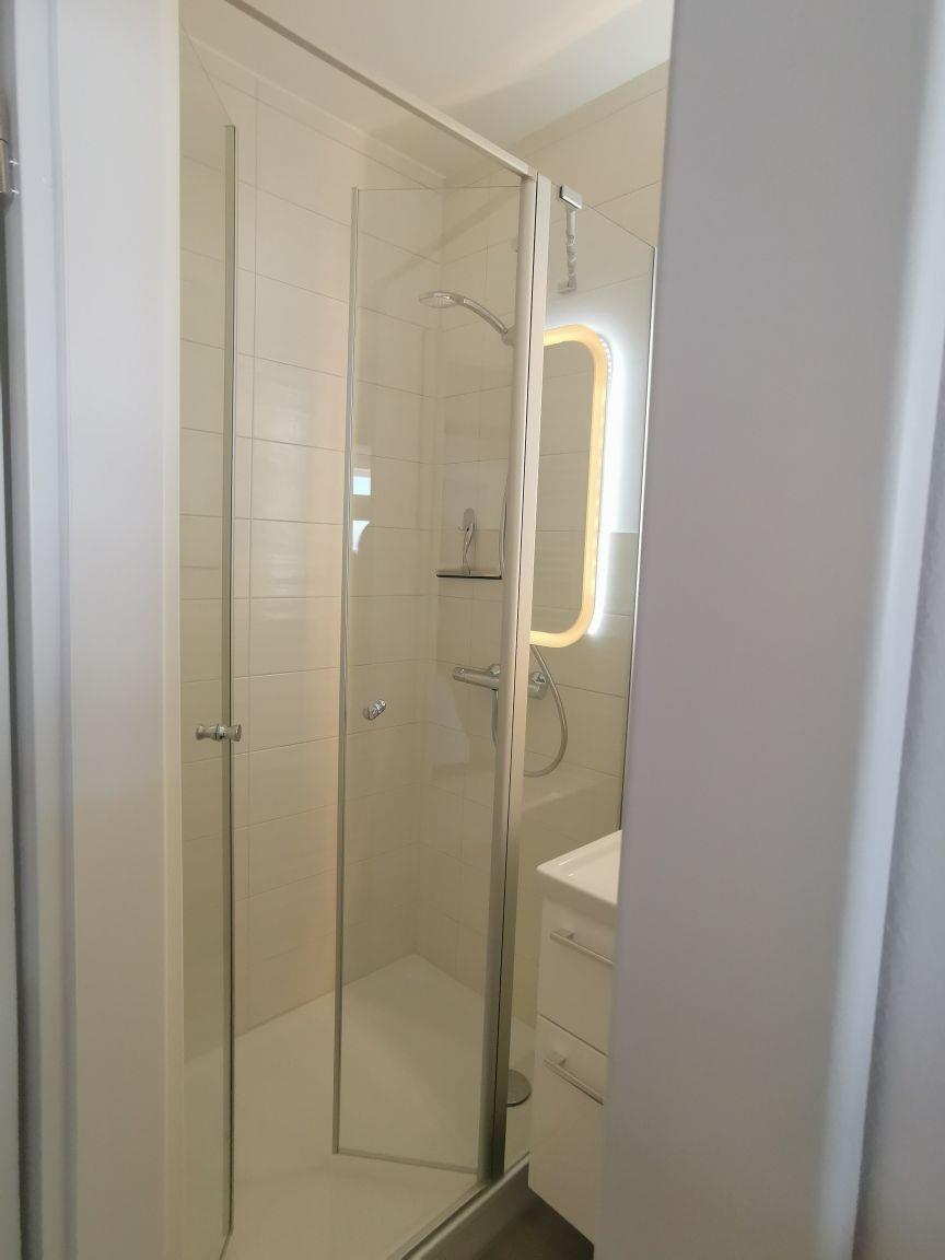 Das neue, hell geflieste Bad verfügt über eine besonders geräumige Dusche mit Glaswänden und extra flachem Einstieg. Handtuchheizkörper, Steckdosen, ein Waschbeckenunterschrank mit Schubladen sowie ein beleuchteter Spiegelschrank sind weitere Annehmlichkeiten die Ihnen dieses Duschbad im Urlaub bietet.