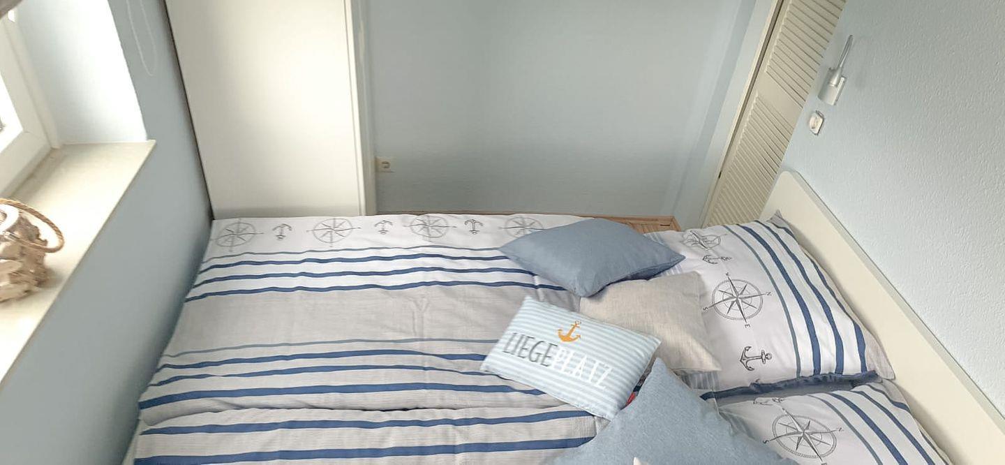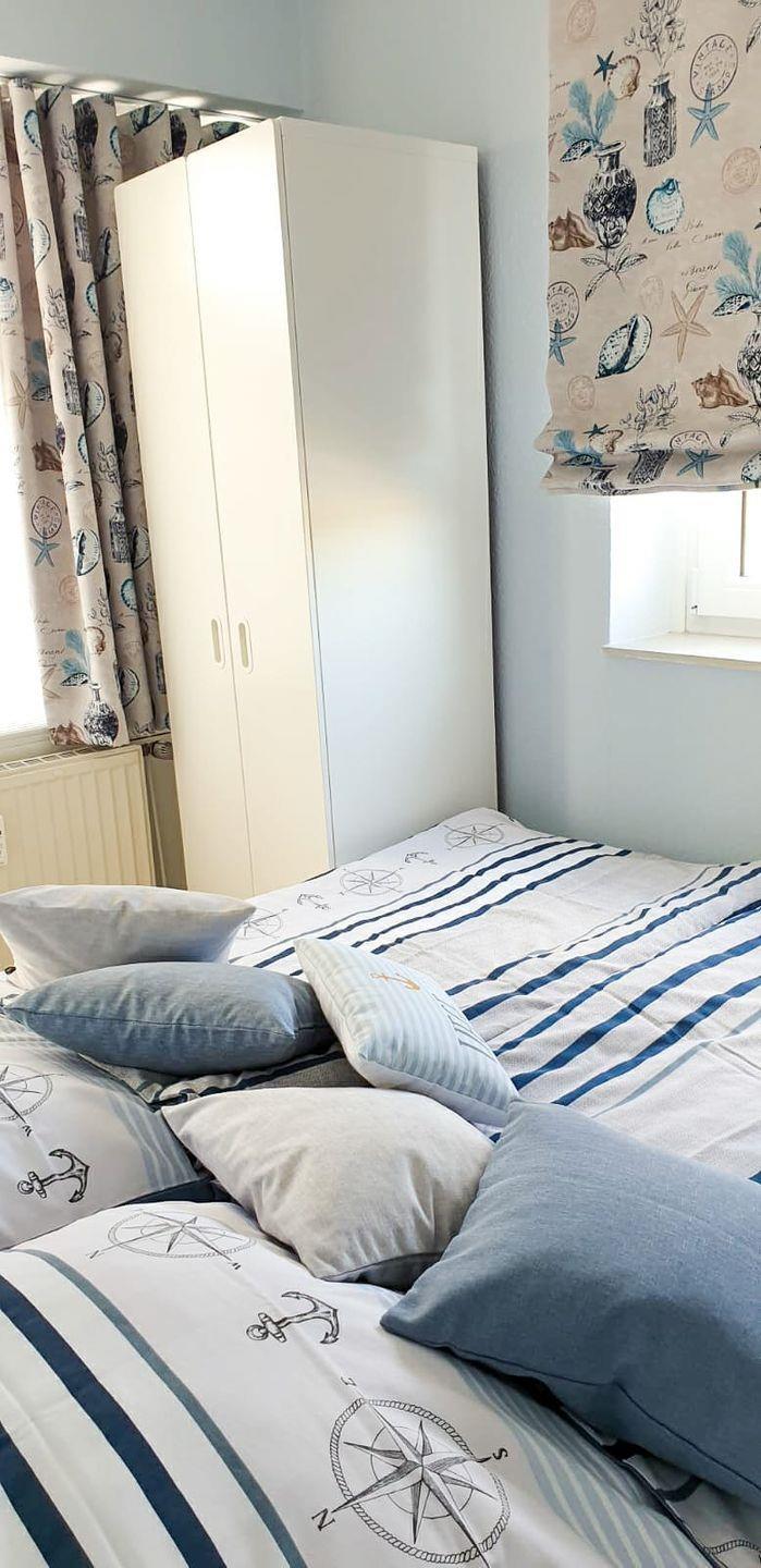 Das kleine Schlafzimmer mit zwei Fenstern ist mit einem Doppelbett (160 cm*190 cm) und 2 Kleiderschränken für Ihre Urlaubsgarderobe ausgestattet. Der Zugang zum Schlafzimmer erfolgt über zwei, rechts und links des Bettes eingebaute, Schiebetüren.