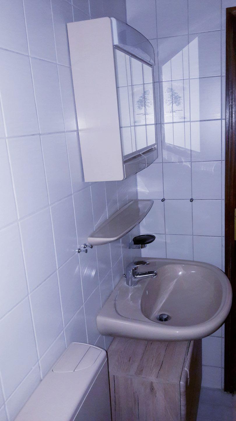 Das kleine Badezimmer verfügt über eine Duschwanne mit Abtrennung, Waschbecken, WC und Spiegelschrank.