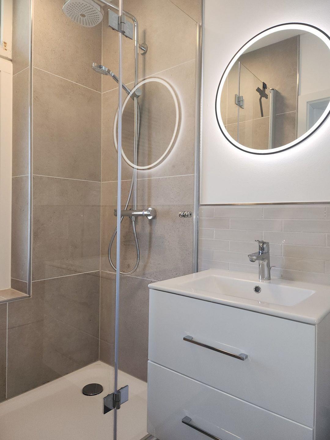 Das kleine, innenliegende Bad ist mit WC, Dusche mit hoher Duschwanne und fester Duschwand sowie Waschbecken mit beleuchtetem Spiegelschrank ausgestattet.
