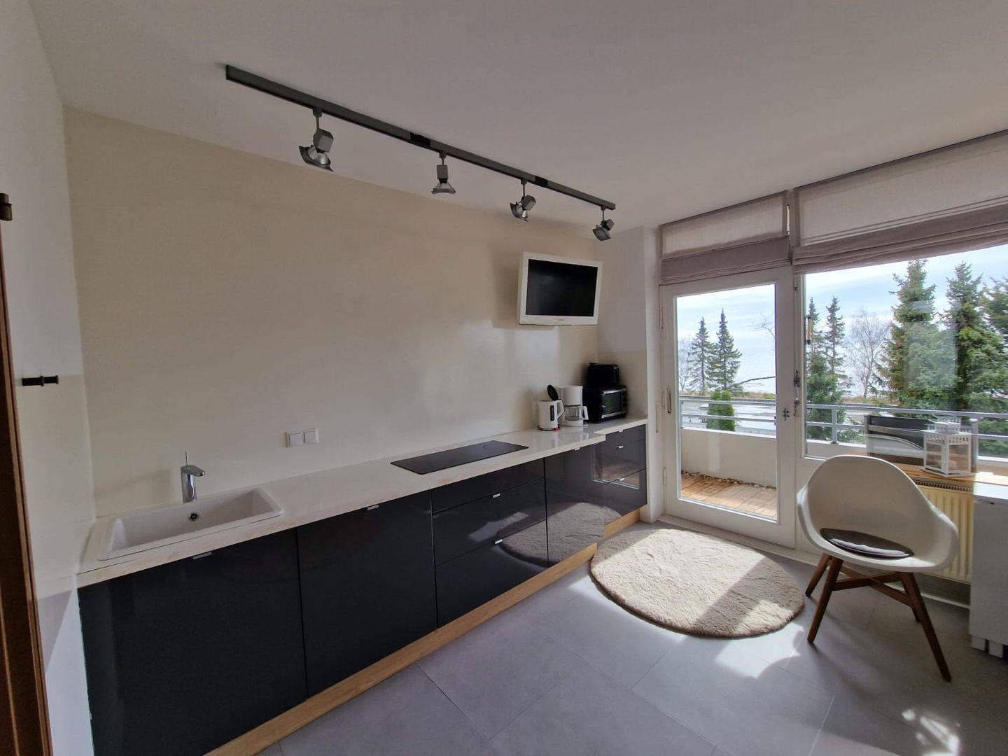 Hier befindet sich auch die moderne Küchenzeile, die mit Geschirrspüler, 3-er Ceranherd, Minibackofen und umfassender Ausstattung zum Zubereiten und Genießen Ihrer Urlaubsmahlzeiten punktet. Am Esstisch am Fenster können Sie gemeinsam mit Blick auf die Ostsee Ihr Essen zu sich nehmen, Gesellschaftsspiele spielen oder Ihren nächsten Urlaubstag planen.