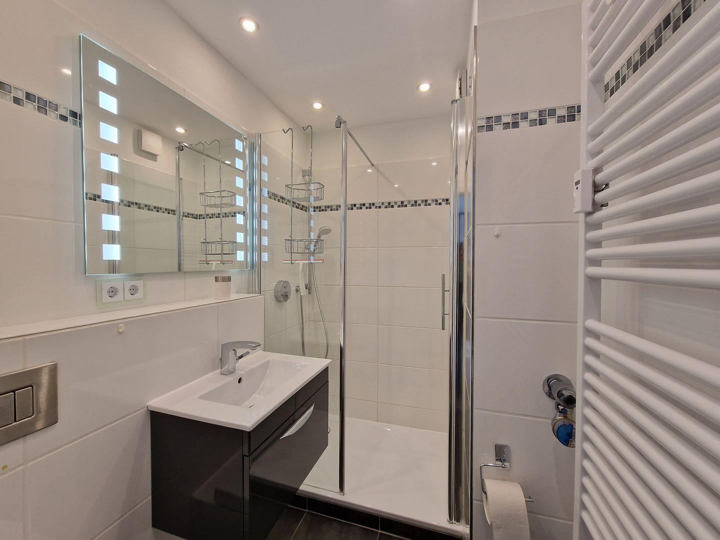 Das Badezimmer wurde ebenfalls modernisiert: Die Dusche punktet mit komfortabel-flachem Einstieg und hochwertiger Glasduschwand. Der große beleuchtete Spiegel, 2 Steckdosen, elektrische Lüftung, Haartrockner und Handtuchheizkörper runden die Ausstattung des Duschbads ab.