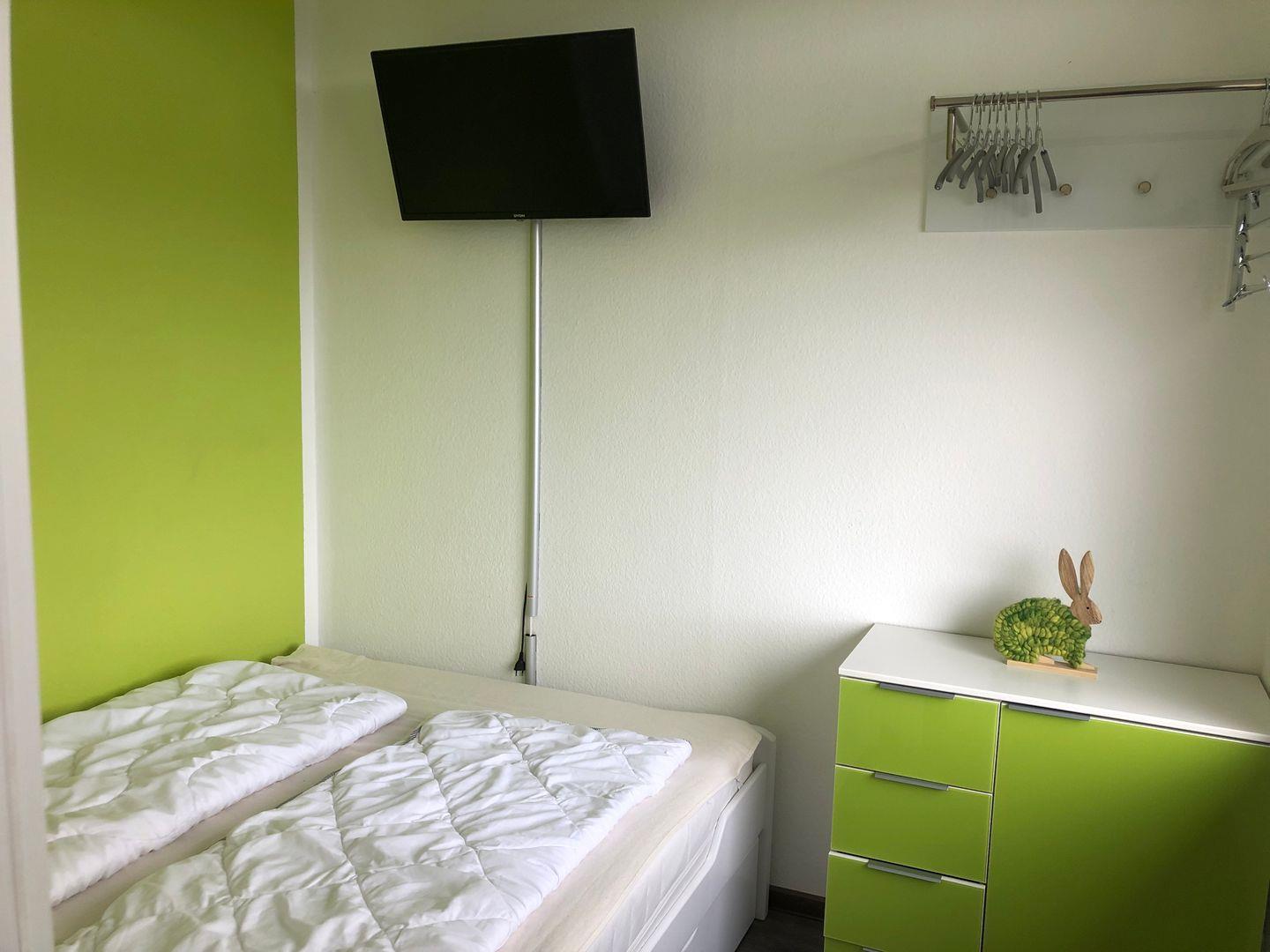 Im frischen Schlafzimmer finden Sie ein gemütliches Doppelbett (140*200 cm), sowie eine Kommode, Kleiderstange und ein weiteres TV-Gerät. Das große Fenster ist mit einem Plissee ausgestattet.