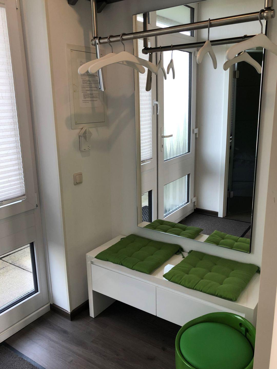 Im Flur werden Sie vom frischen Garderobenbereich empfangen: Ein großer Spiegel, Sitzbank mit Staumöglichkeit und Garderobenstange warten darauf Ihnen Jacken und Schuhe abzunehmen.