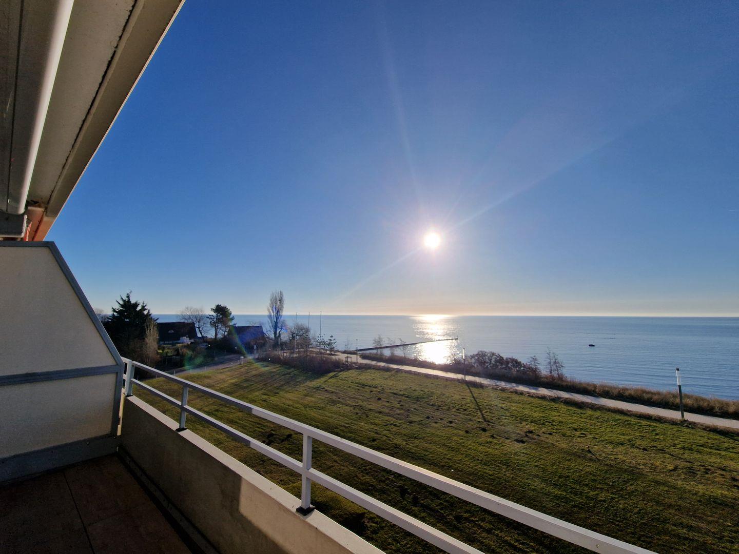 Vom Wohnzimmer gelangen Sie auf den möblierten, sonnigen Südbalkon mit unschlagbarem Meerblick aus erster Reihe. Falls es mal zu sonnig wird schützt eine Markise vor zu großer Hitze.