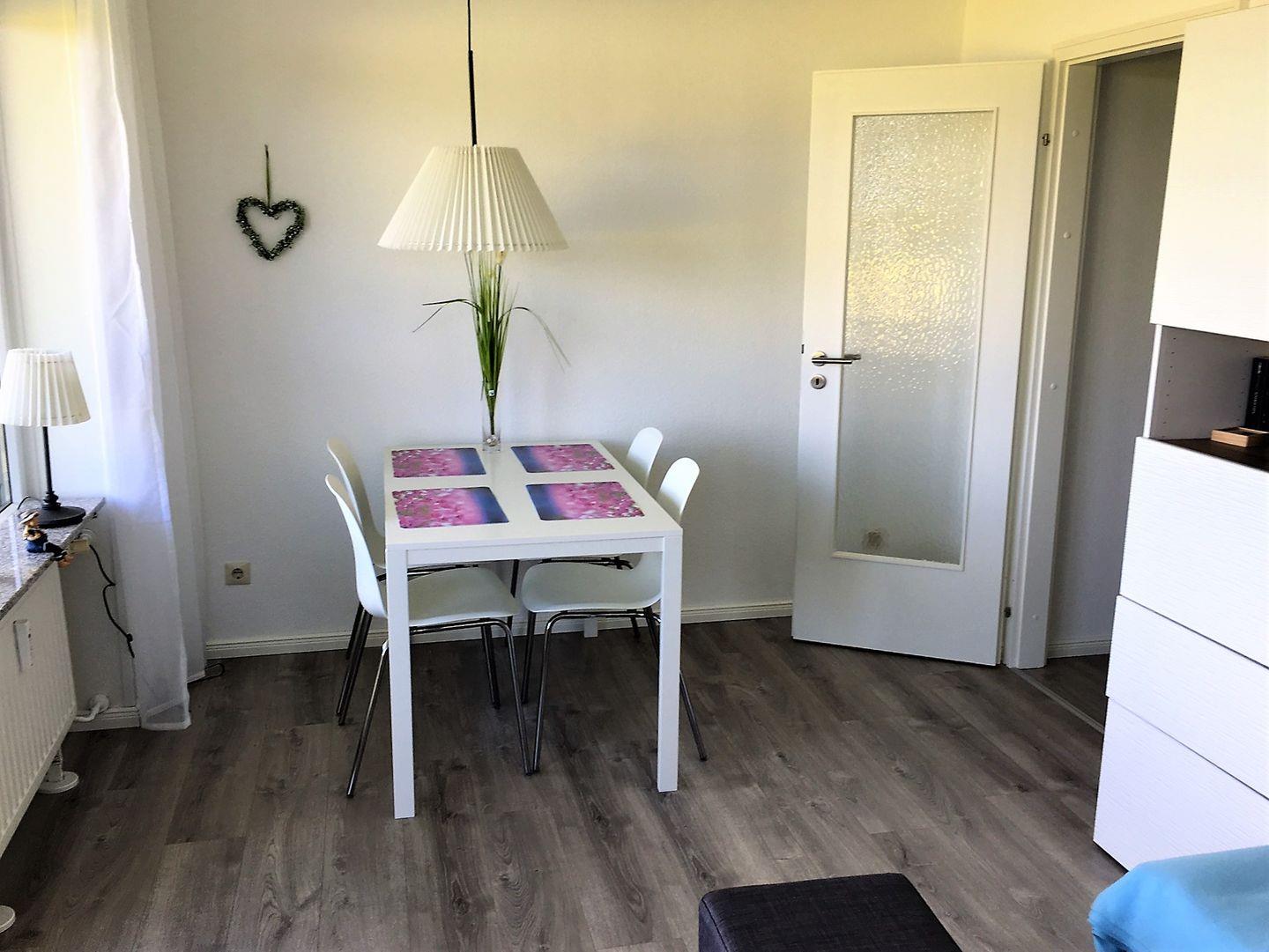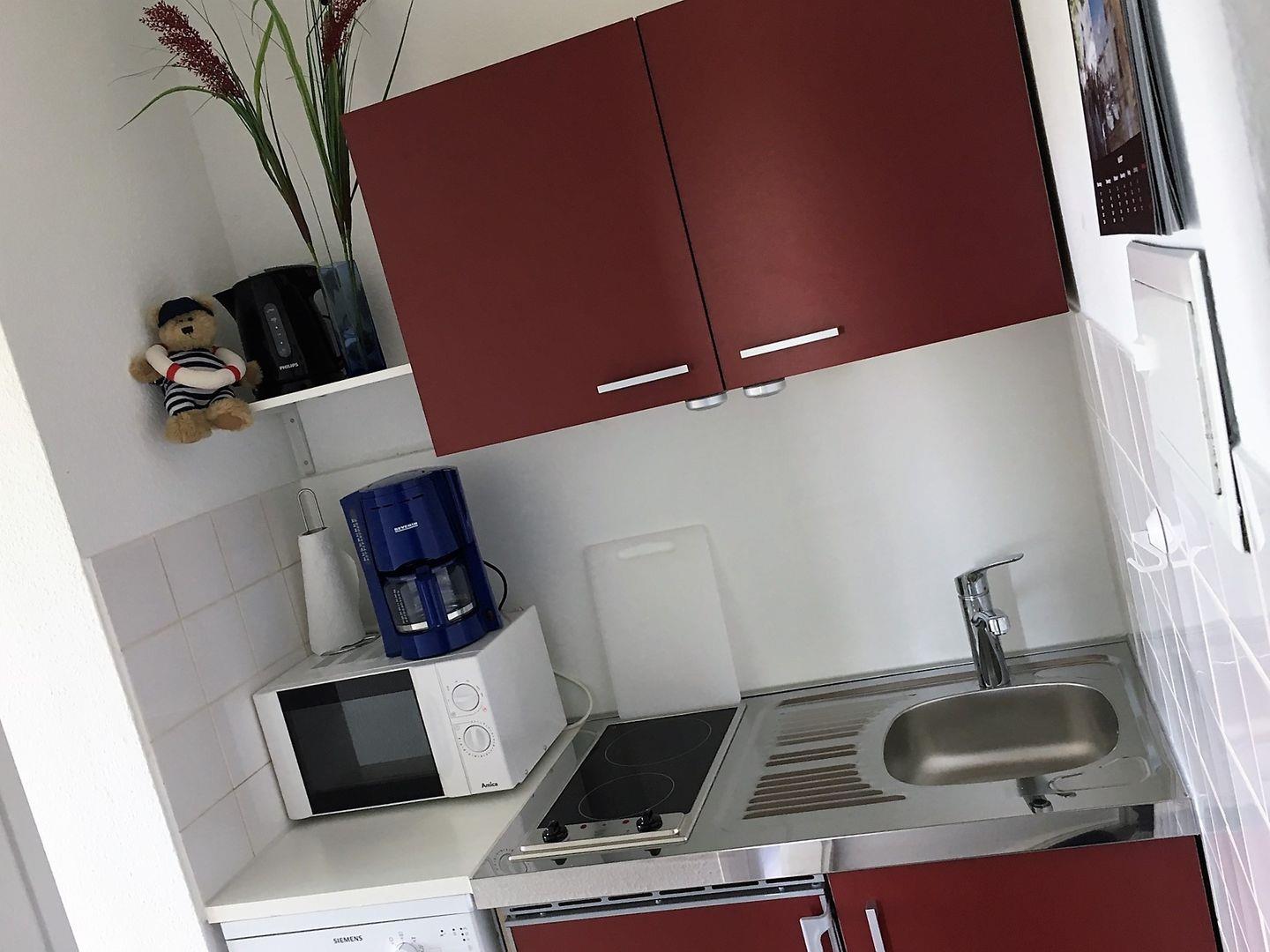 Die kompakte Küche finden Sie im Flur zum Wohnzimmer. Geschirrspüler, Kühlschrank mit kleinem Gefrierfach, Microwelle und 2-Platten-Herd bieten Ihnen die Möglichkeit zur Selbstversorgung.
