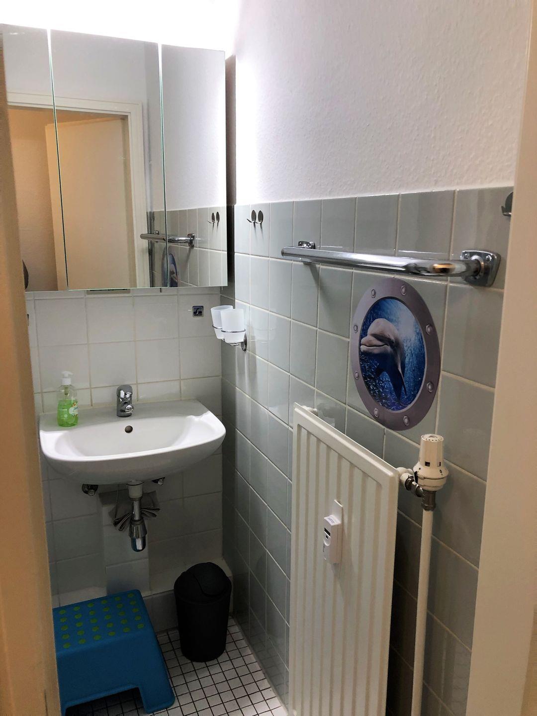 Das kleine Bad steht mit allem Notwendigem wie Dusche mit fester Duschwand, WC, Waschbecken mit beleuchtetem Spiegelschrank, Haartrockner und Hocker für die Lütten bereit.