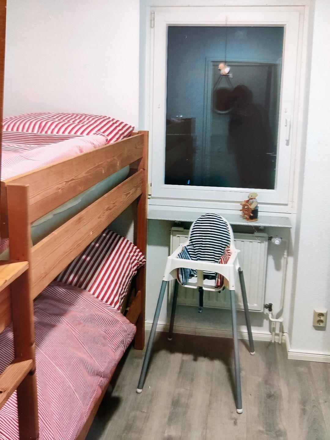 Im ersten Schlafraum stehen ein Etagenbett (2*90*200 cm) sowie ein viertüriger Kleiderschrank mit Kleiderstange, Schubladen und Regalfächern bereit. Hier finden alle großen und kleinen Urlauber genügend Platz Ihren Kofferinhalt zu verstauen.