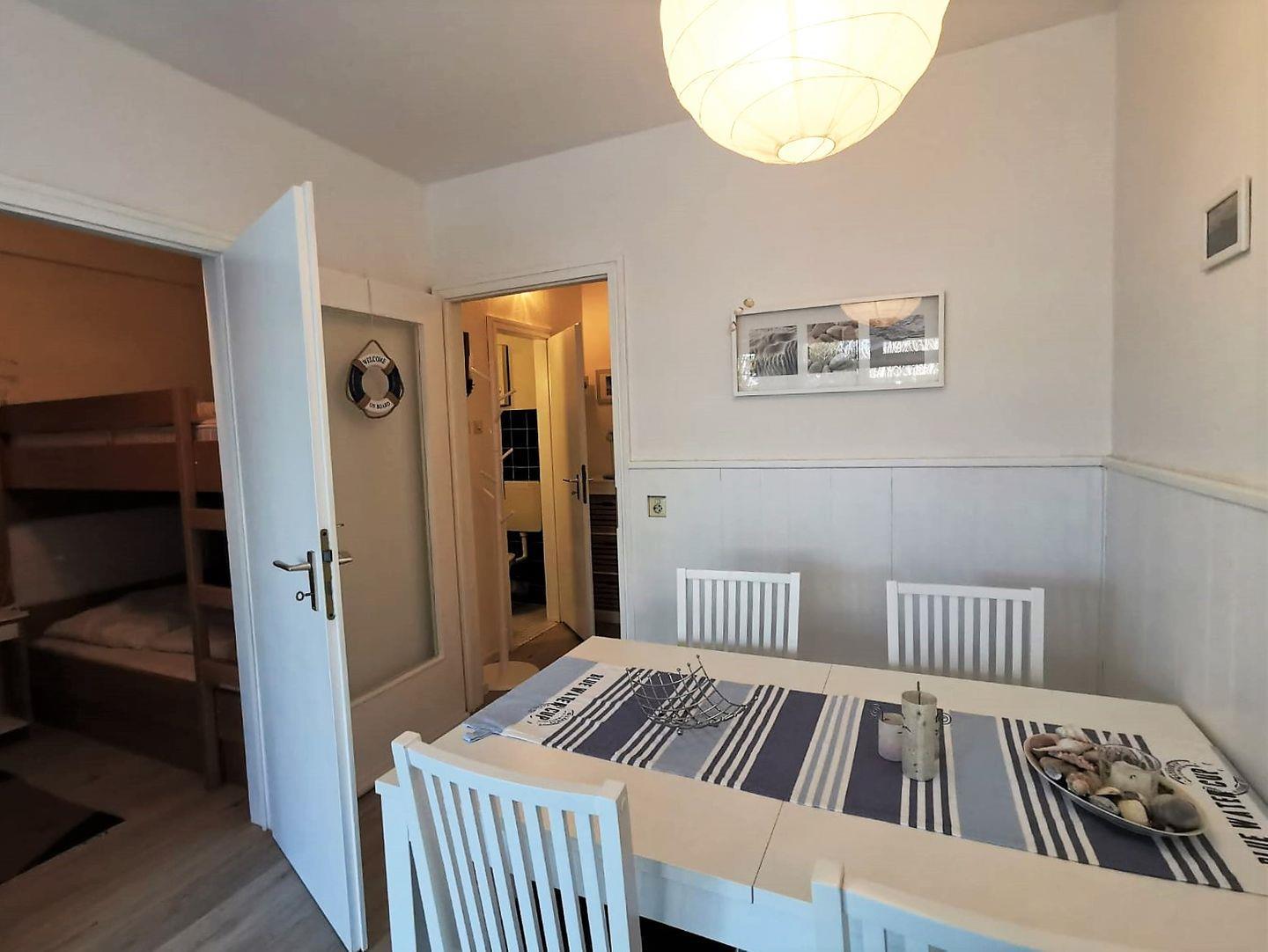 Im kombinierten Ess-/ Wohn-/ Schlafzimmer finden am Esstisch alle Gäste Platz für gemeinsame Mahlzeiten, Spieleabende oder die Planung des nächsten Urlaubstages.