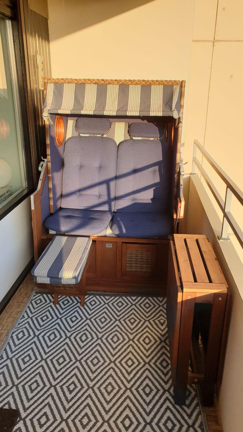 Von dem großen Balkon genießen Sie aus dem 4. Stock den atemberaubenden Blick auf das glitzernde Meer zu Ihren Füßen. Lauschen Sie hier vom Strandkorb aus unter der Markise dem Meeresrauschen bei einem guten Getränk oder starten Sie den Tag mit einem Frühstück in der Morgensonne.
