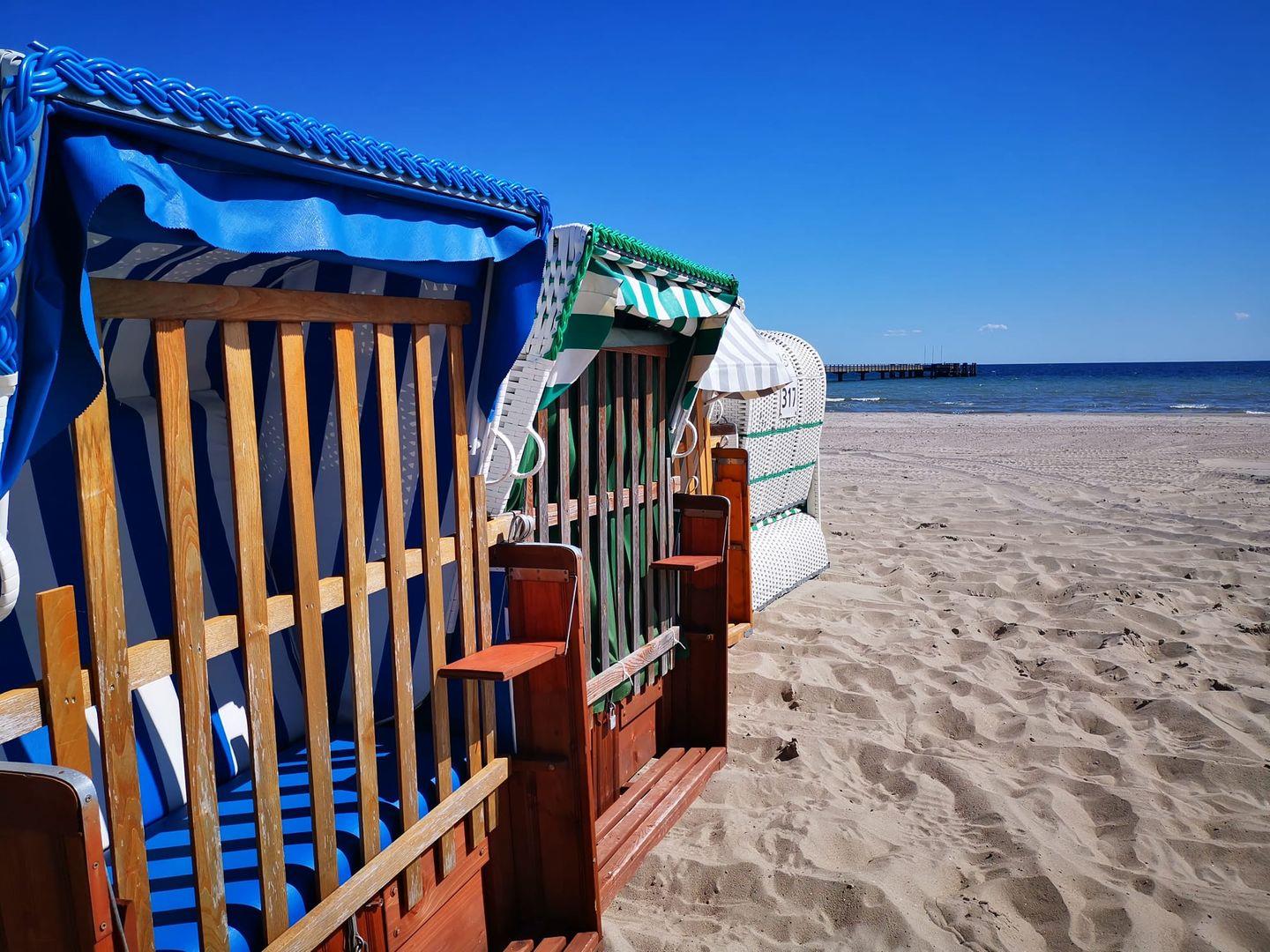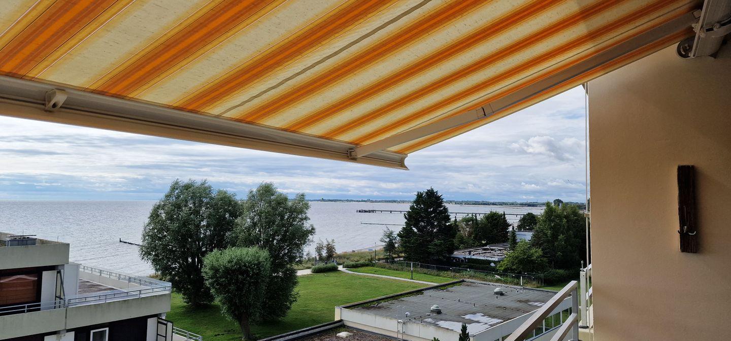 Von dem großen Balkon genießen Sie aus dem 5. Stock den atemberaubenden Blick auf das glitzernde Meer zu Ihren Füßen. Lauschen Sie hier vom Strandkorb aus unter der Markise dem Meeresrauschen bei einem guten Getränk oder starten Sie den Tag mit einem Frühstück in der Morgensonne.