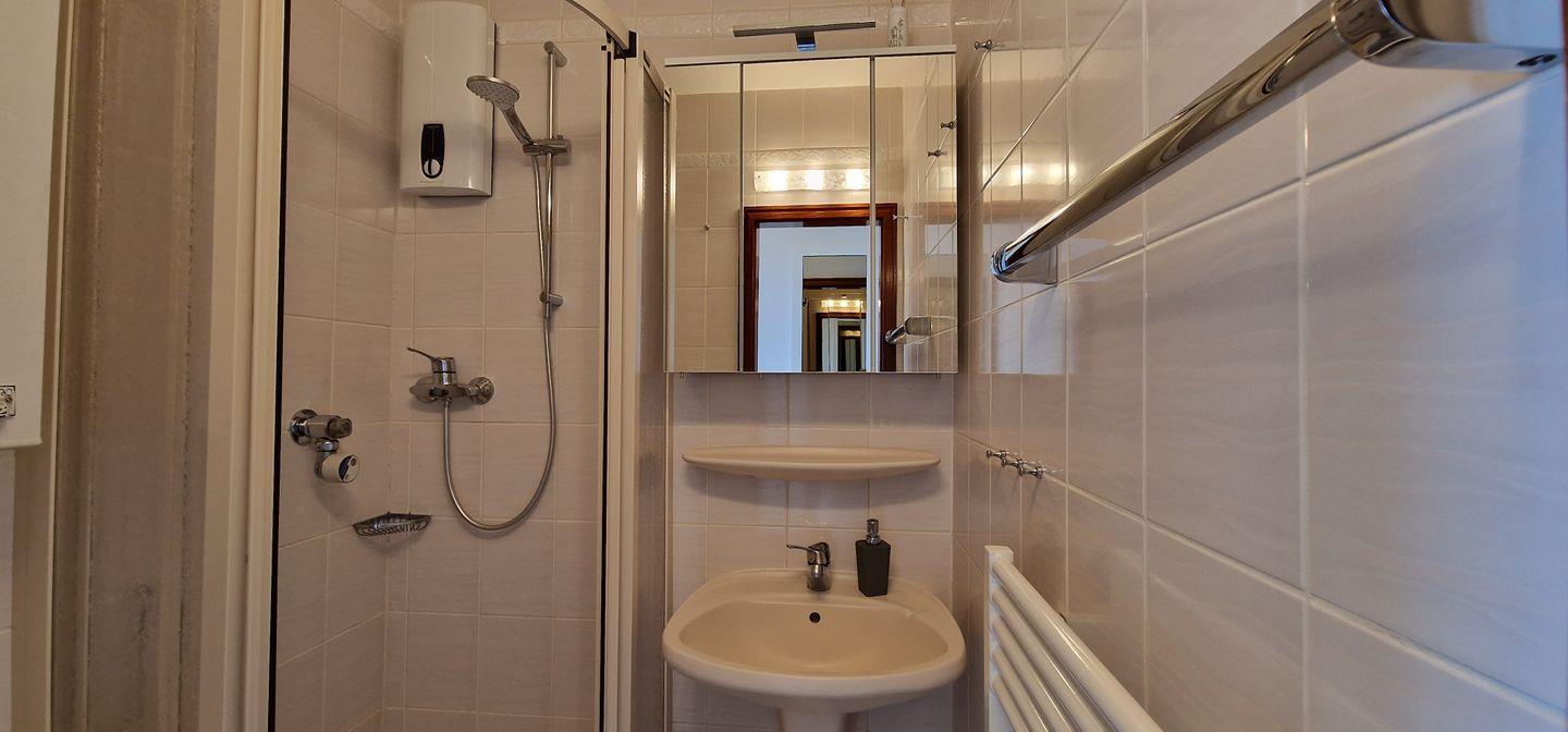 In dem hell gefliesten Badezimmer befindet sich eine Eckdusche und diverse Ablagemöglichkeiten, auch ein Handtuchheizkörper und ein Haartrockner stehen den Gästen zur Verfügung.