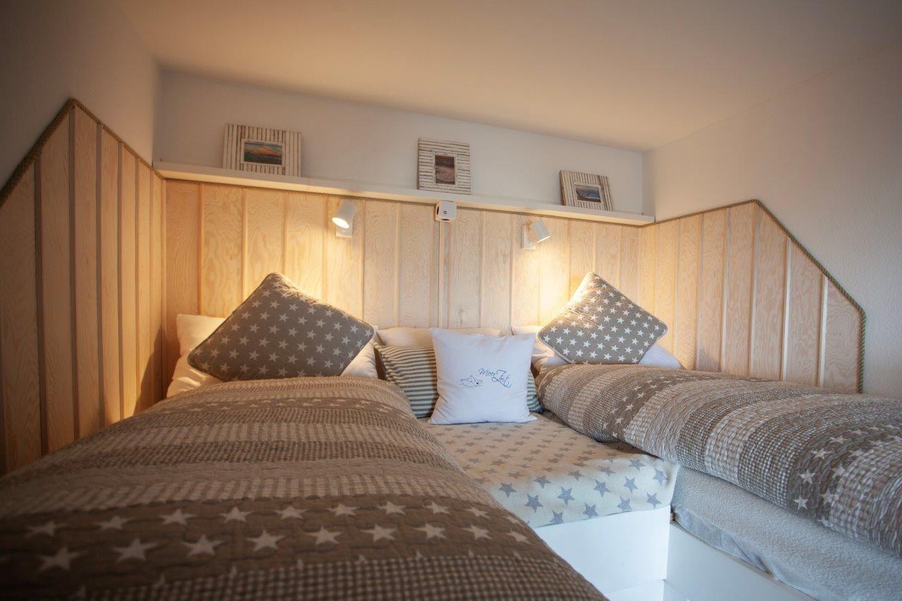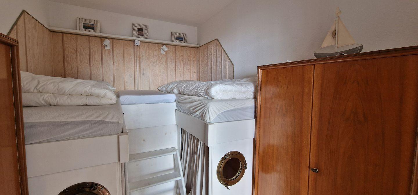 In dem Schlafzimmer, welches mit dem Wohn- und Essbereich verbunden ist, befinden sich zwei höher gelegene Betten (80 *200 cm), unter welchem sich zusätzlich zum Abstellraum Staumöglichkeiten befinden. Vom Bett aus können Sie hier direkt auf das Meer schauen!