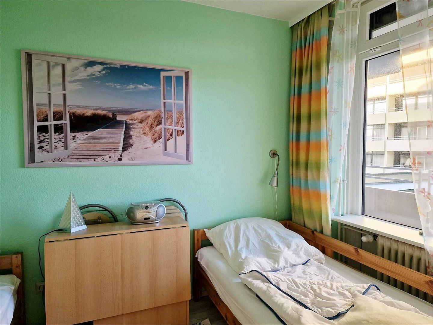 Im Schlafzimmer befinden sich zwei Einzelbetten, sowie eine Kommode und ein weiteres TV-Gerät. Das Schlafzimmer wirkt durch das große Fenster sehr hell und freundlich.