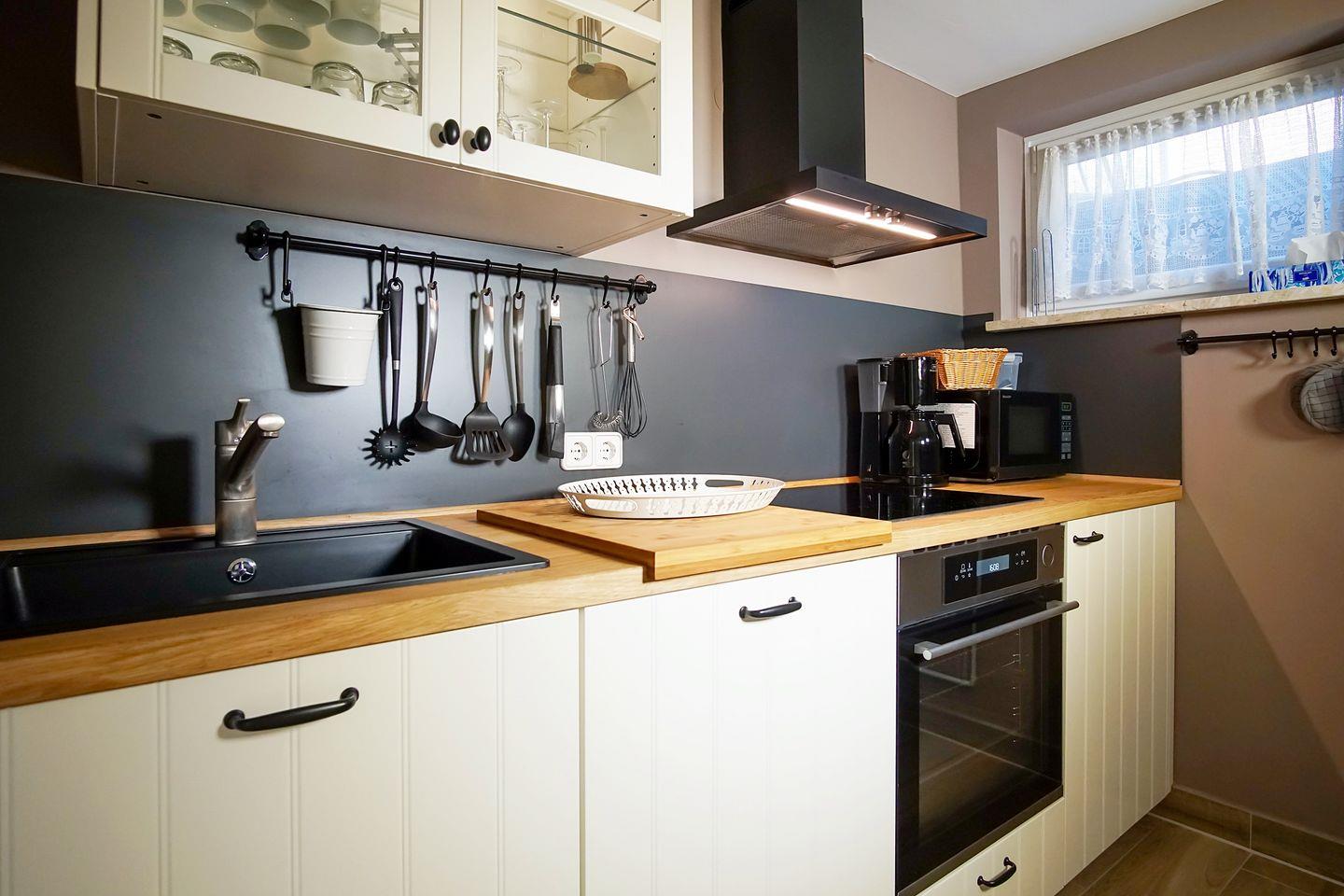 Die Küchenzeile verfügt über Microwelle, Backofen, Kühlschrank mit Tiefkühlfach, Spüle und alle Ausstattungen zum Kochen und Servieren. Die gemütliche Essecke bietet Platz für gemeinsame Mahlzeiten, Spieleabende oder die Planung des nächsten Urlaubstages.