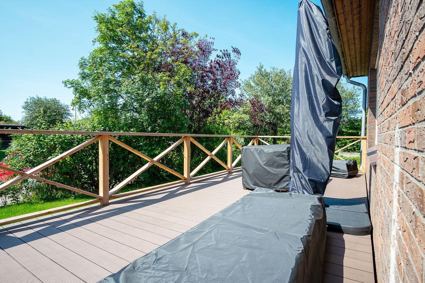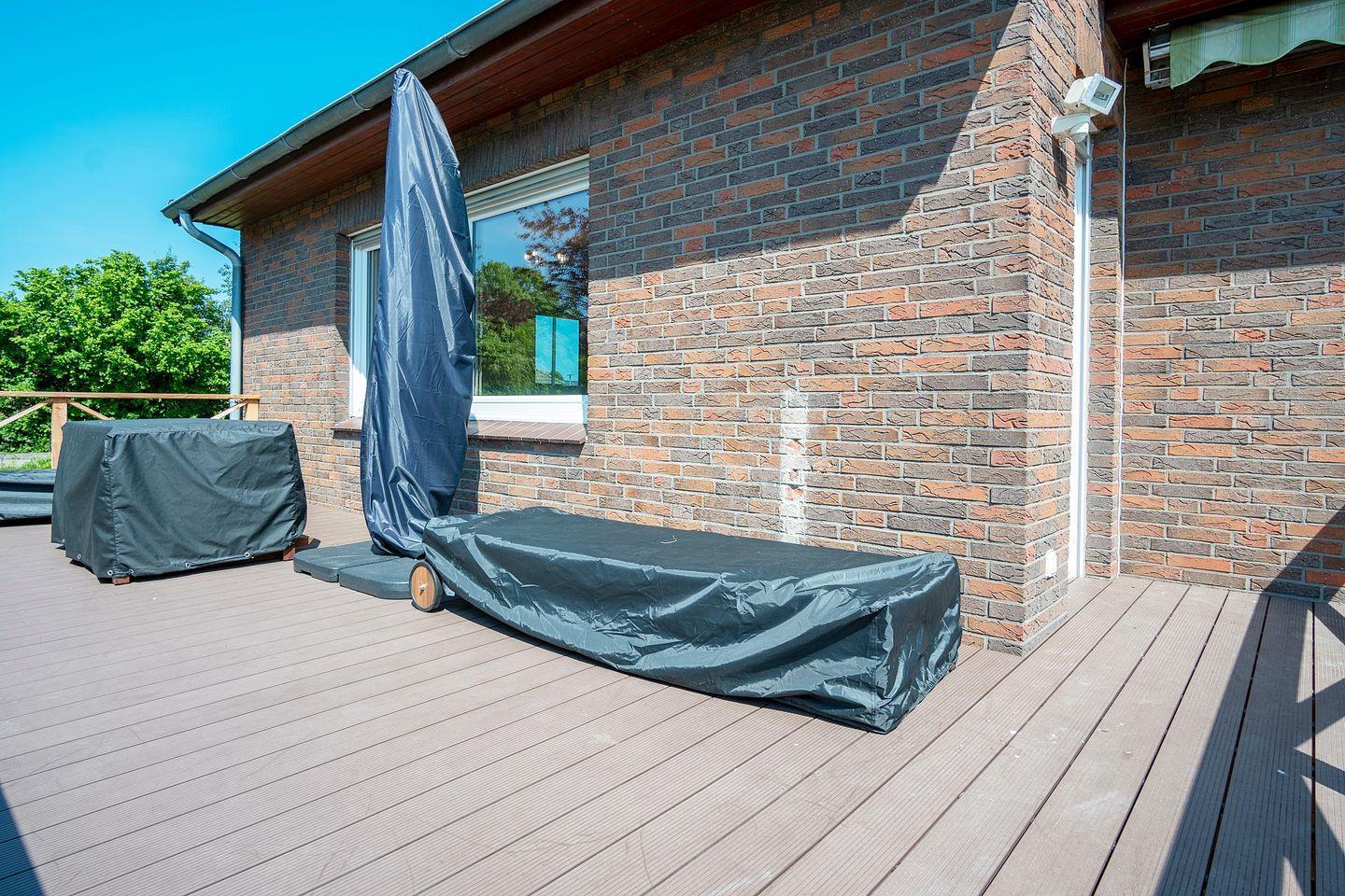 Besonders hervorzuheben ist die traumhafte Terrasse, welche aufgrund der guten Sonnenlage den ganzen Tag zum Sonnenbaden einlädt. Hier stehen für Sie Gartenmöbel, ein große Markise und Relaxliegen bereit, der vorhande Grill rundet das Angebot für einen chilligen Sommerabend ab. Das ganze Haus bietet ausreichend Sichtschutz durch die vorhandenen Jalousien und Rolläden.