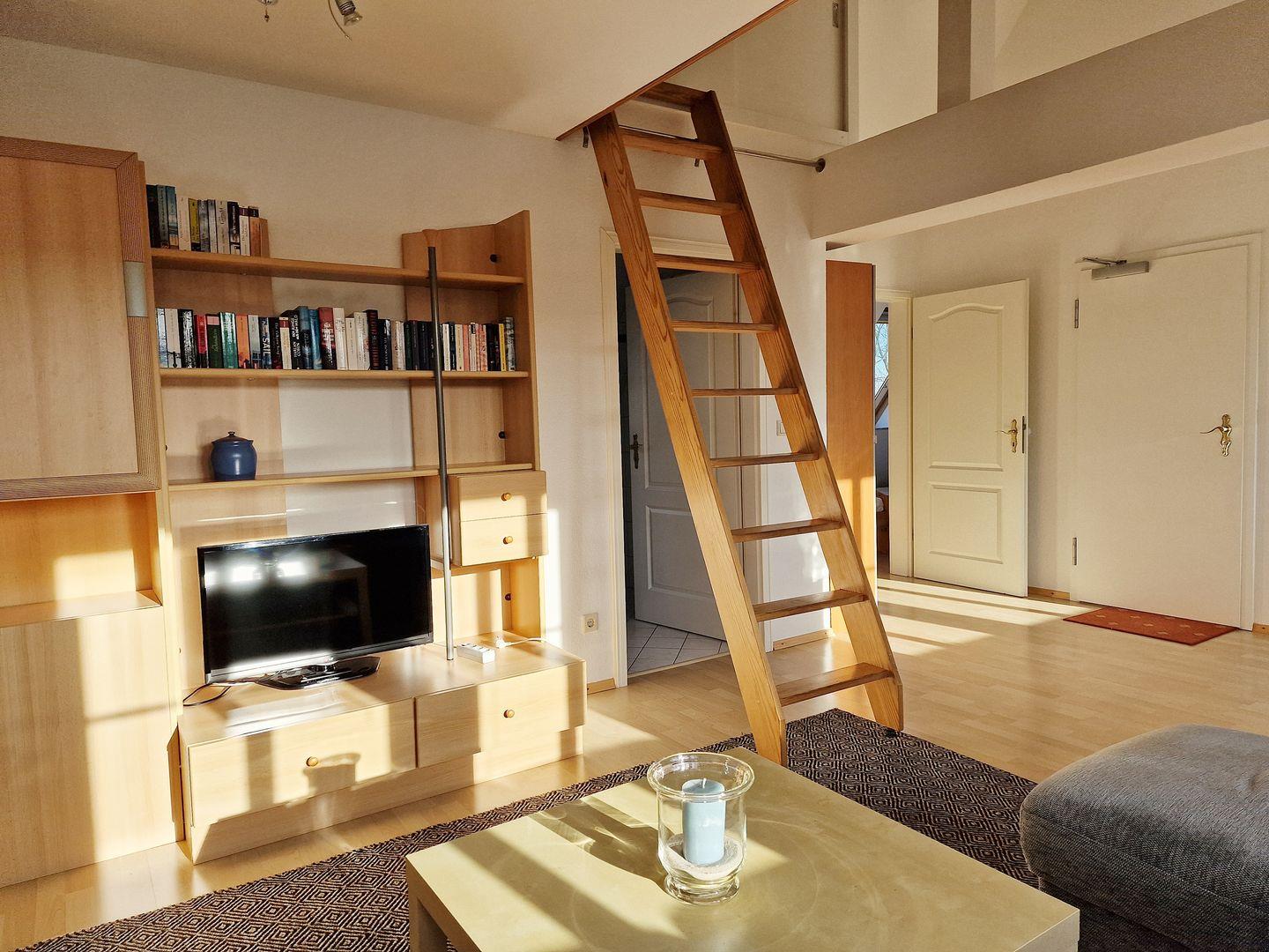 Oberhalb des Wohnbereiches befindet sich ein bodengleicher Schlafplatz (Doppelbett), welcher über eine Leiter zu erreichen ist.