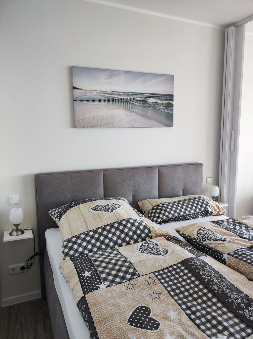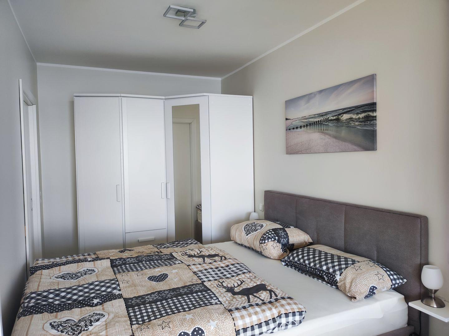 Im Schlafbereich steht ein hochwertiges Doppelbett (160*200) für entspannte Urlaubsnächte bereit. Dahinter findet sich jede Menge Platz für Ihre Urlaubsgarderobe in dem großen Kleiderschrank.