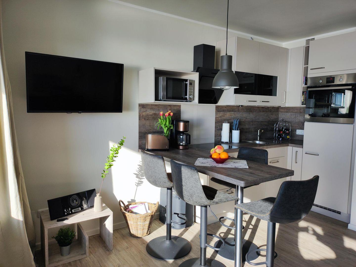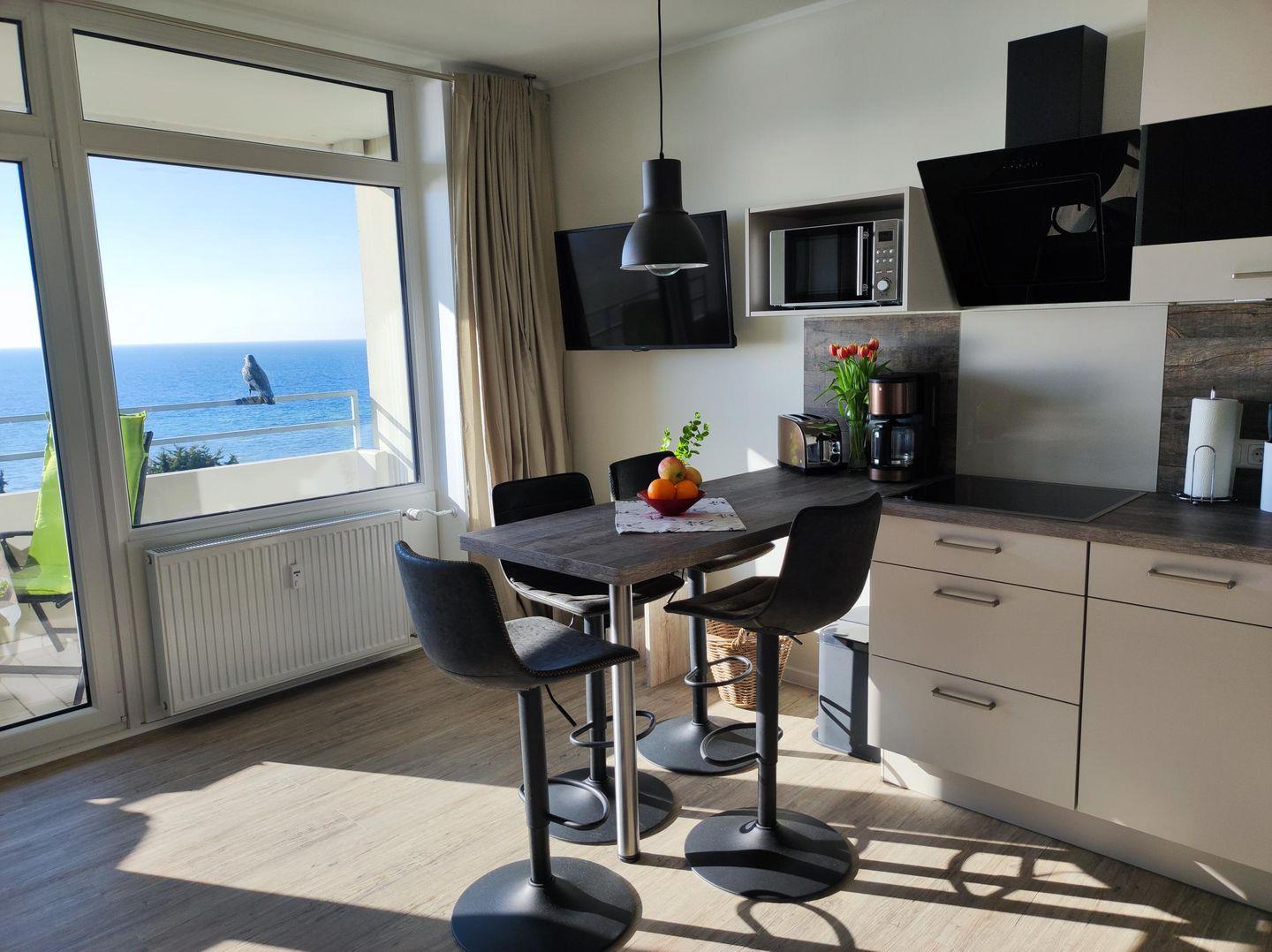 Im Wohnbereich wartet eine großes gemütliches Ecksofa mit Blick aufs Meer auf Sie. Der an der Wand befestigte Flachbildfernseher über dem großzügigen Essplatz in Form eines Tresens sowie ein W-Lan-Zugang sorgen für weitere Unterhaltung.