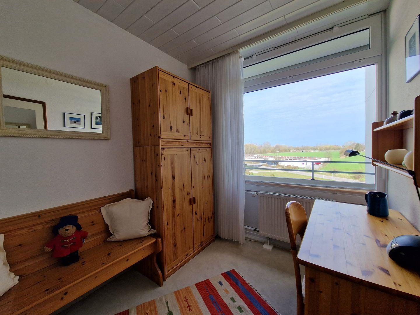 Das zweite Schlafzimmer hält eine Schlafmöglichkeit (90cm*200cm), einen Kleiderschrank und einen Schreibtisch vor.