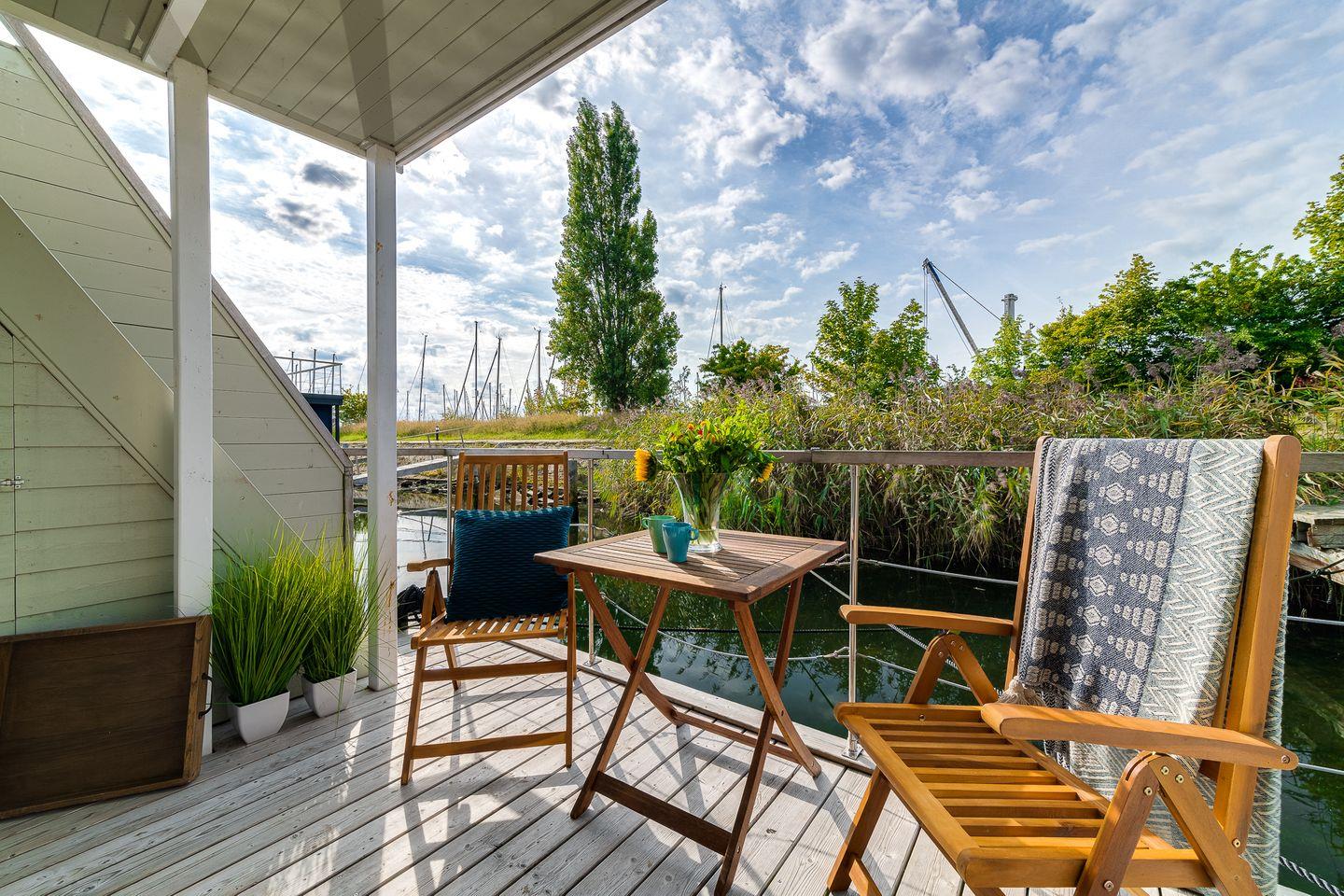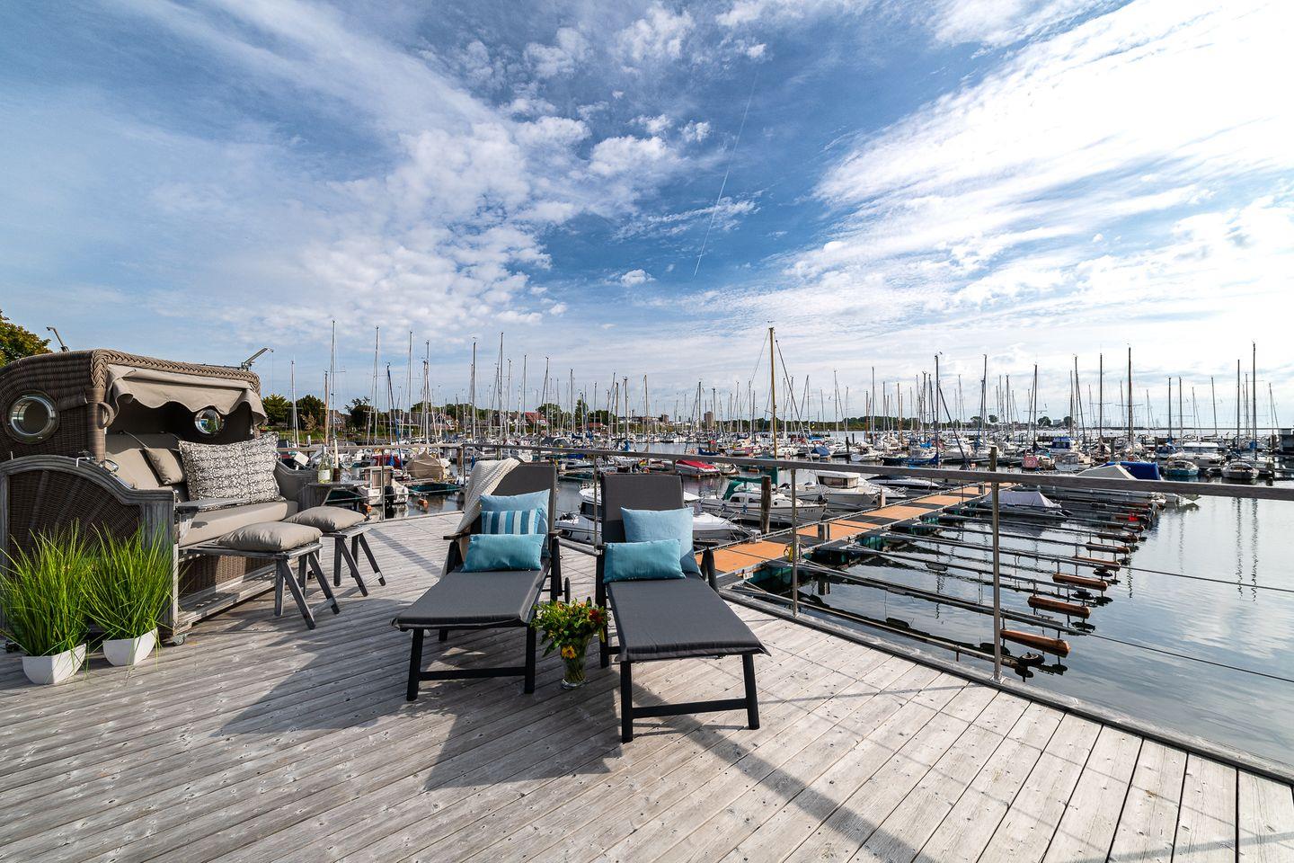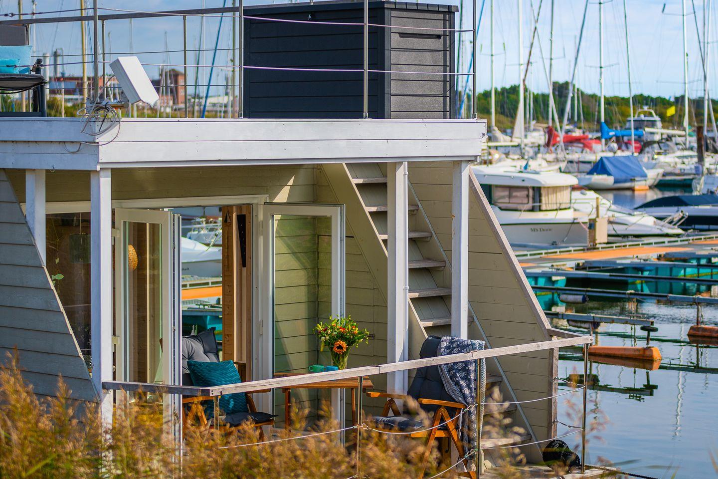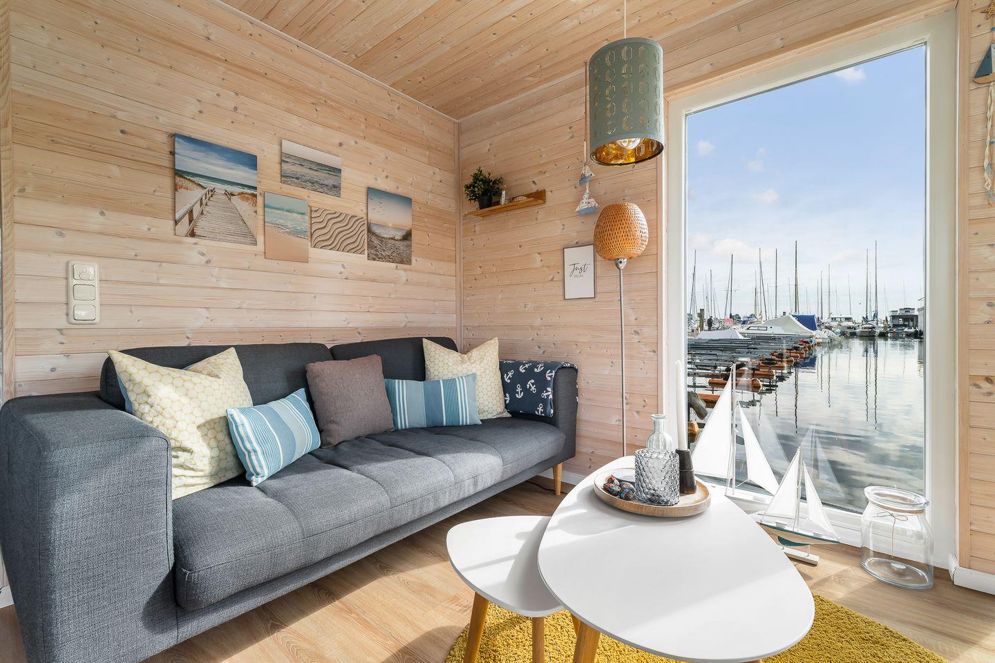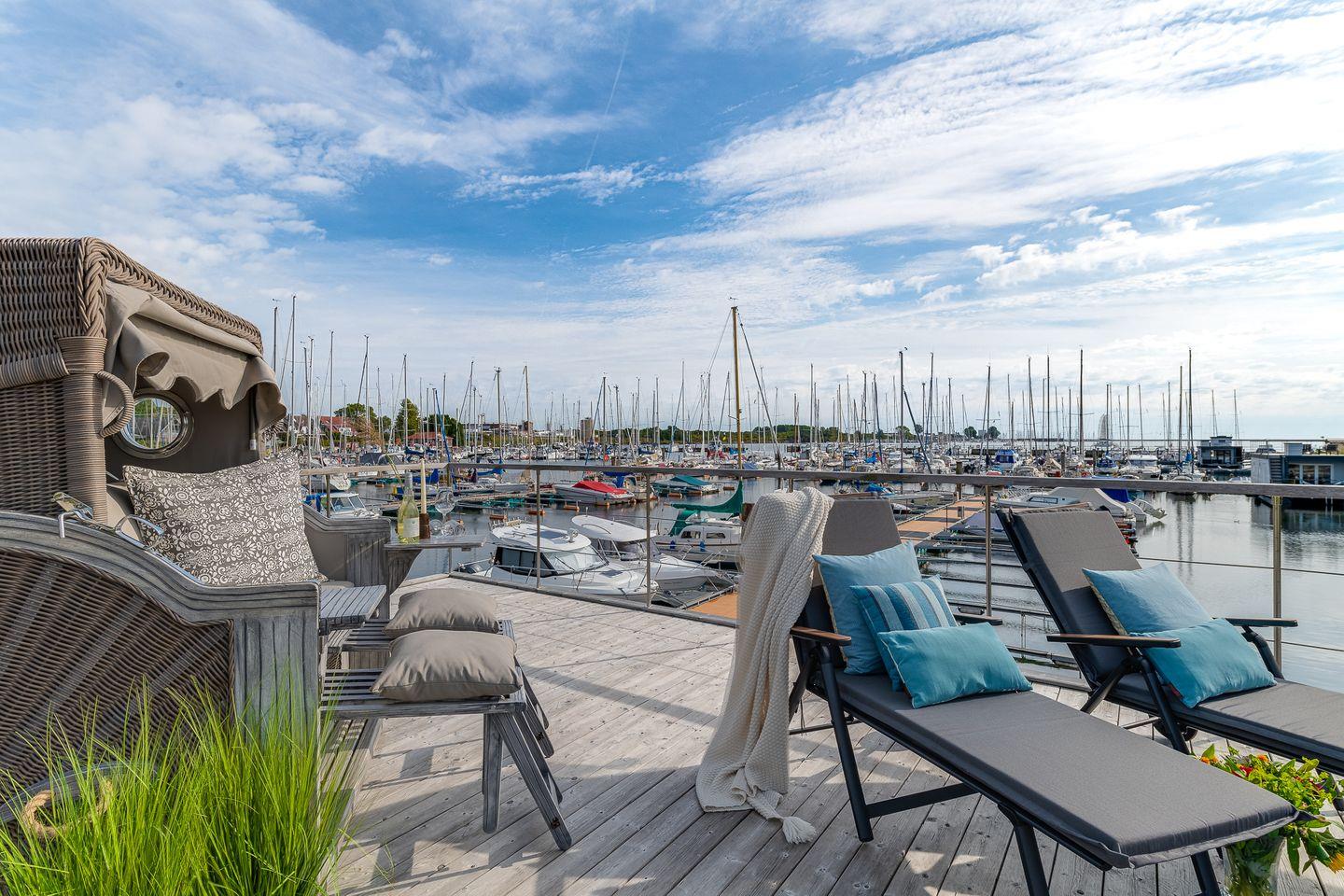 Erleben Sie traumhaften Hausboot-Urlaub in Großenbrode mit Blick auf Hafen und Ostsee, modern und gemütlich für bis zu 4 Personen.