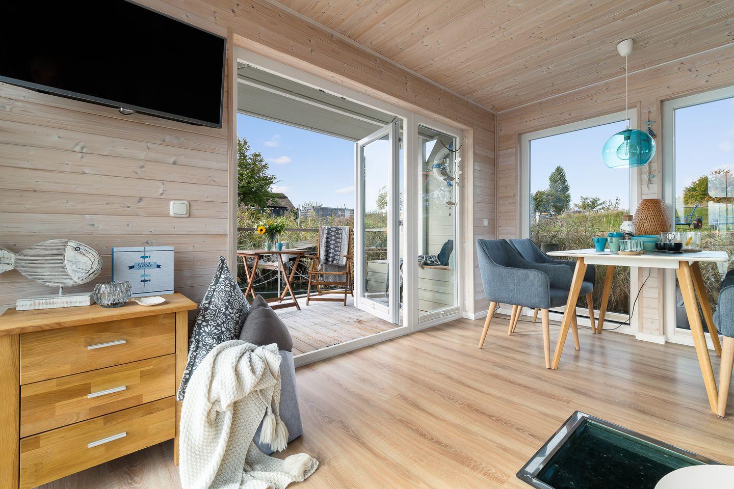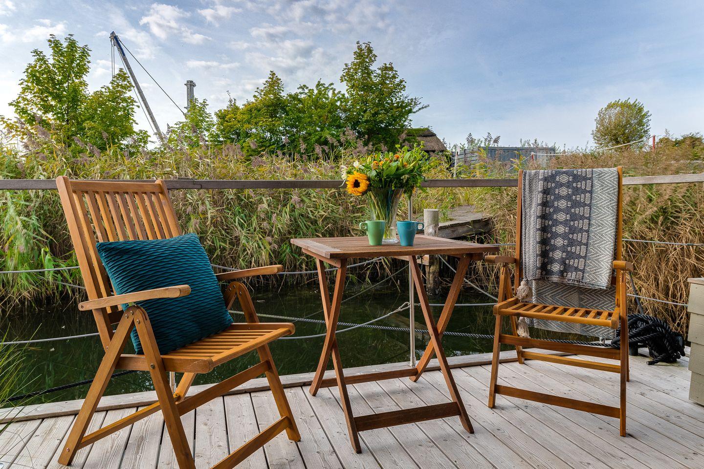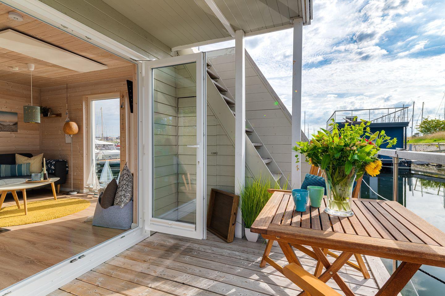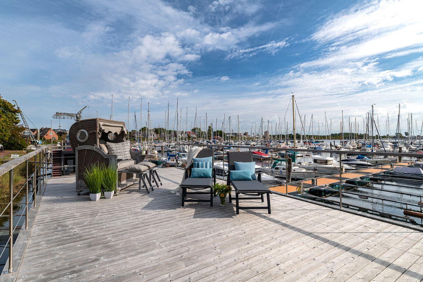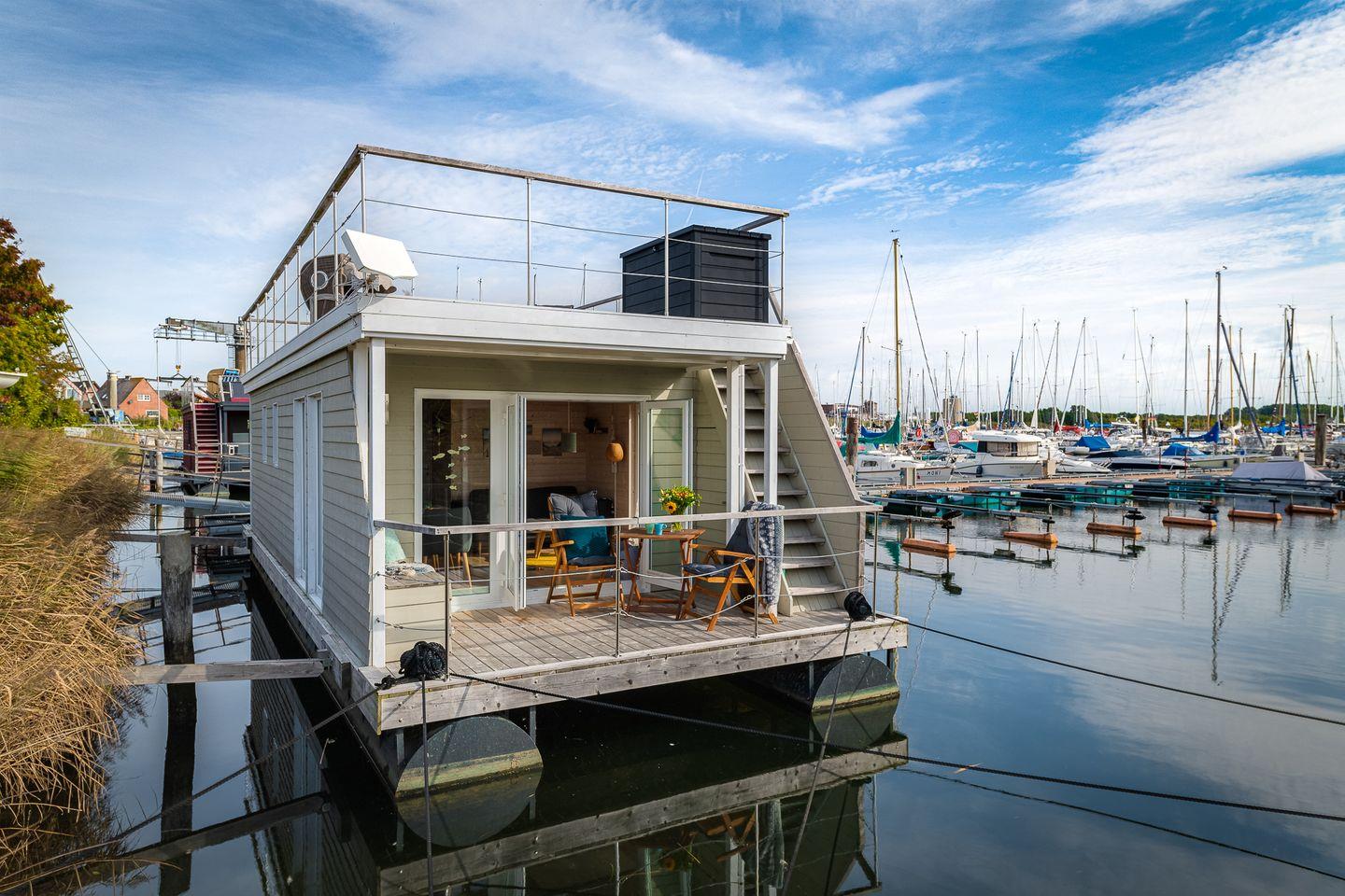 Erleben Sie traumhaften Hausboot-Urlaub in Großenbrode mit Blick auf Hafen und Ostsee, modern und gemütlich für bis zu 4 Personen.