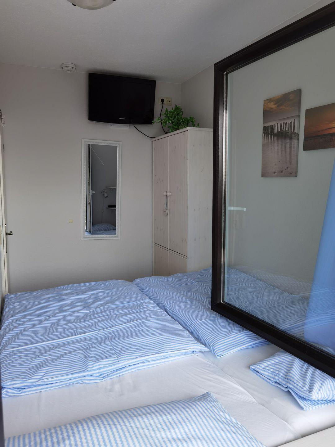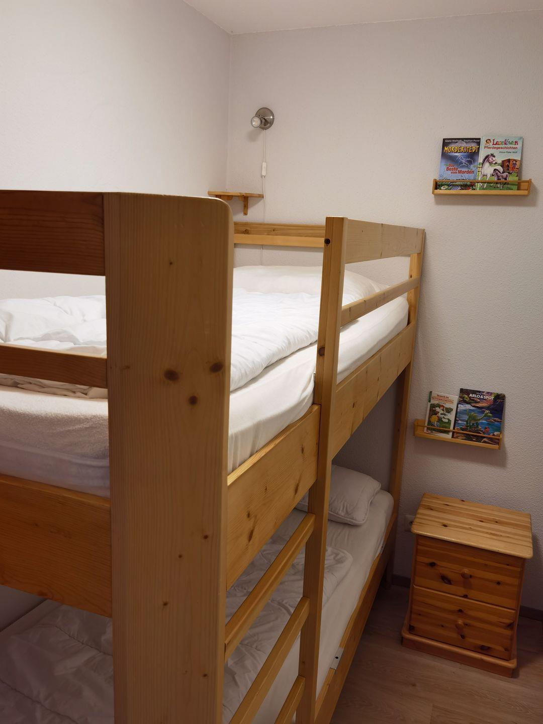 In dem separaten Schlafzimmer mit Ausblick auf den gesamten Südstrand mit Promenade und einem zweiten TV befindet sich ein Doppelbett und ein Kleiderschrank. Die Besonderheit an dieser Wohnung ist die gute Aufteilung und die Verfügbarkeit von noch zwei weiteren Schlafzimmern. Ein Schlafbereich hält ein Etagenbett vor und das zweite Schlafzimmer verfügt über ein Einzelbett.