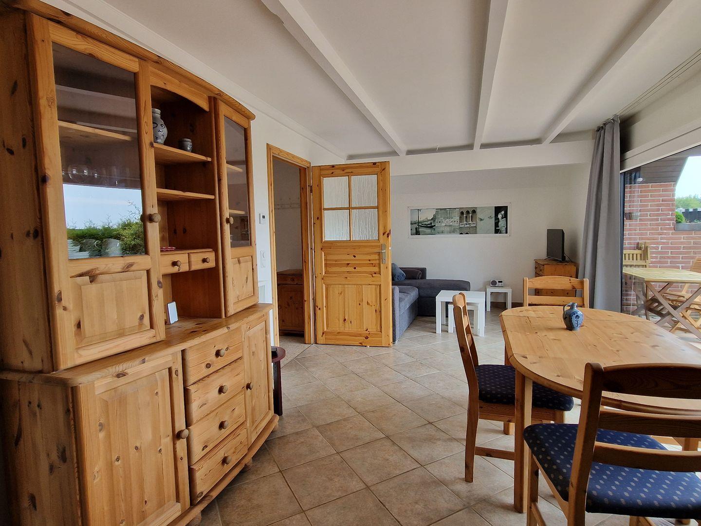 Über den kleinen Eingangsbereich ausgestattet mit einer Garderobe, Kommode und Spiegel erreichen Sie den großzügigen hellen Wohnbereich mit einer großen Fensterfront mit Schiebetür, welche den Zugang zum Terrassenbereich ermöglicht. Genießen Sie hier in einem geschützten Bereich ihre Urlaubszeit bei Meeresrauschen und in sonniger Südlage. Die Terrasse verfügt über Gartenmöbel sowie einen Sonnenschirm, hier kann man in aller Ruhe ein Buch lesen, Sonnenbaden oder gemeinsam zubereitete Mahlzeiten genießen! Über eine kleine Pforte gelangen Sie direkt über die Sackgasse zum Strand!
