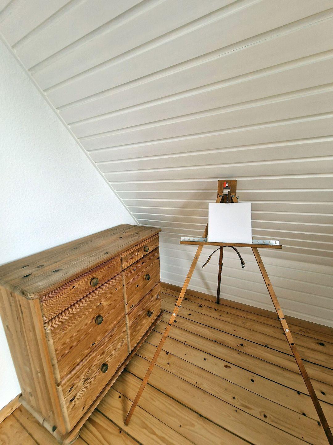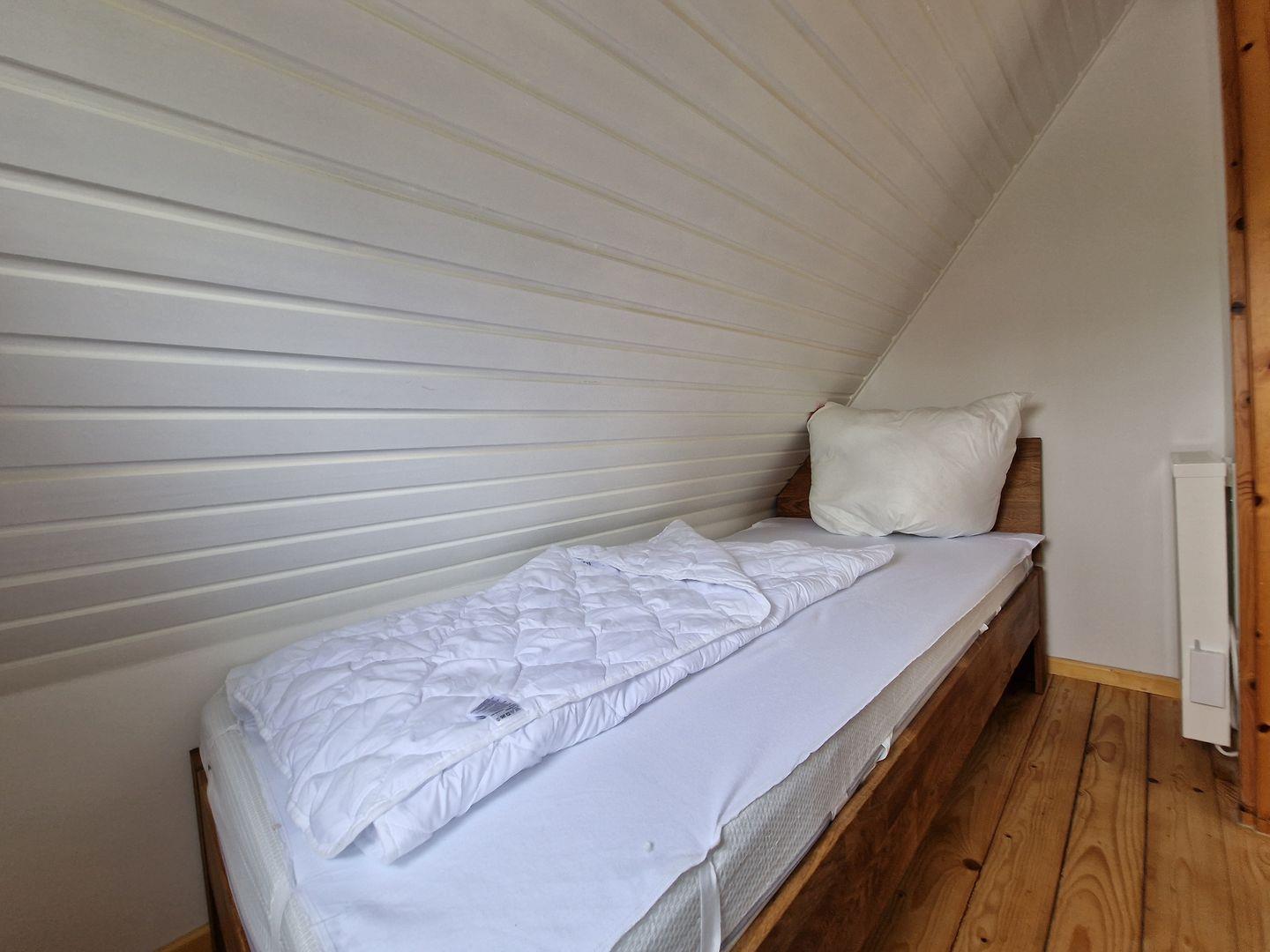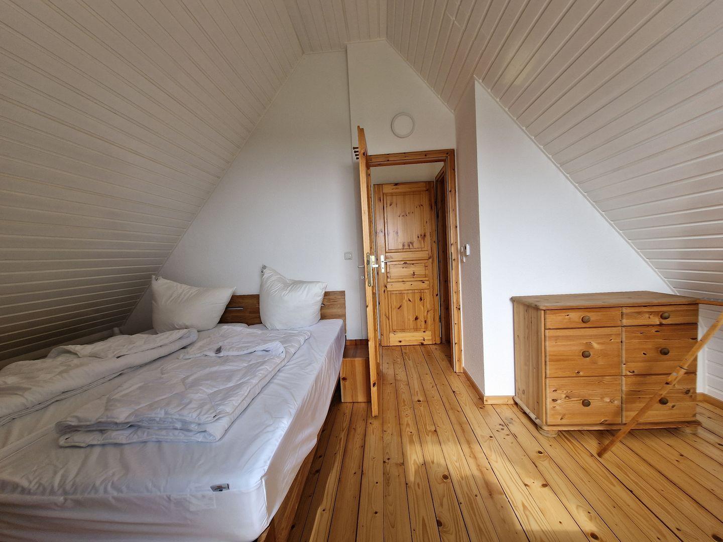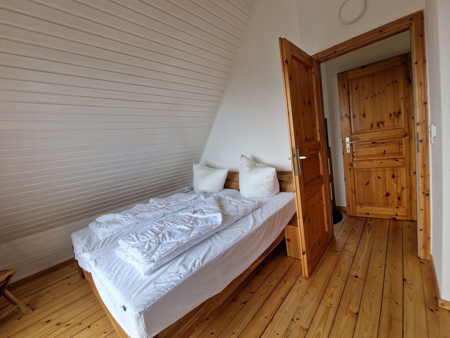 Ein weiterer kleiner Raum mit einem Bett unter einer Dachschrägen sorgt für eine gute Rückzugsmöglichkeit. Hier haben Sie auch noch die Möglichkeit zum Aufhängen der mitgebrachten Urlaubsgarderobe.
