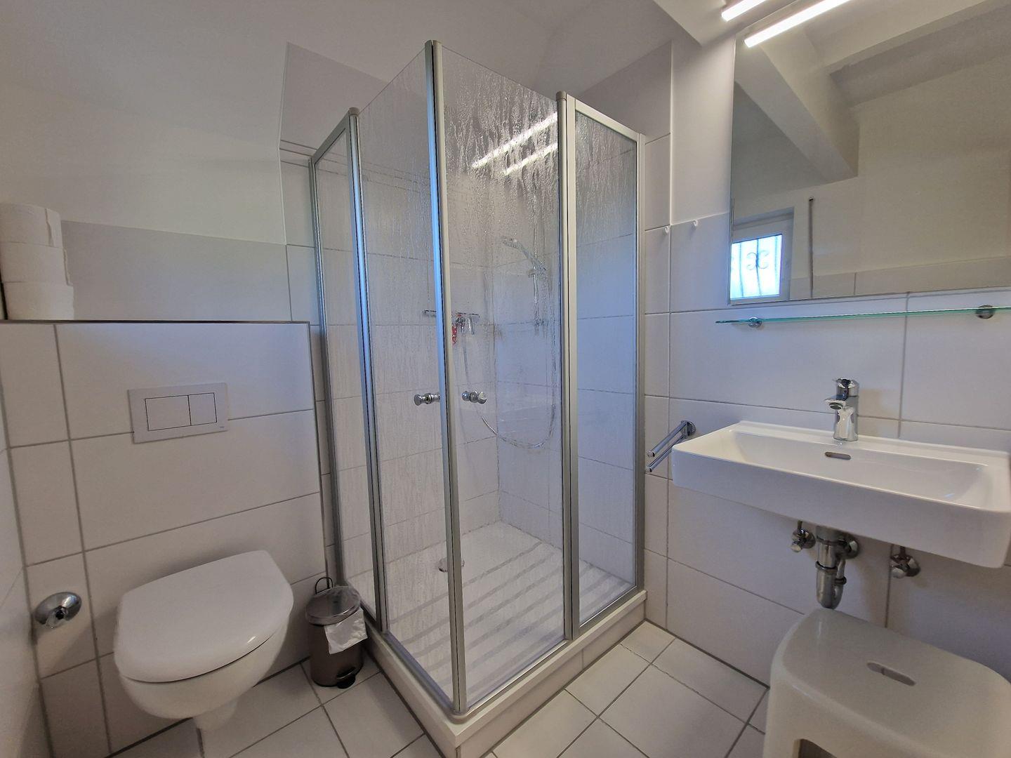 Im Erdgeschoss befindet sich auch das neu sanierte moderne Badezimmer mit flacher Duschwanne, großem Spiegel, Ablagefläche und einem Fenster zum Lüften.