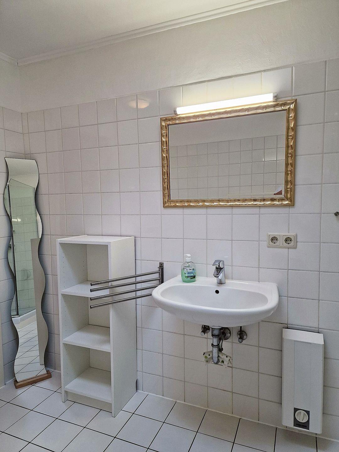 Das innenliegende Badezimmer enthält eine große Dusche mit flachem Einstieg, Spiegel und diversen Ablagemöglichkeiten sowie einen Föhn.