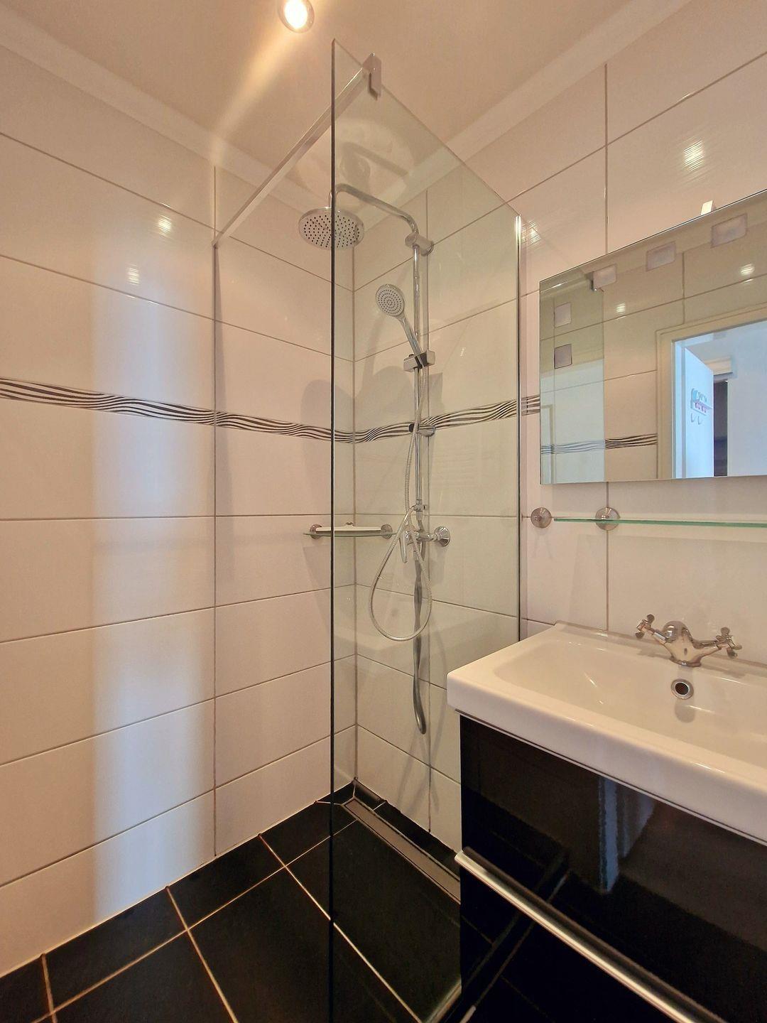 Im sanierten, innenliegenden Duschbad wurde ein Handtuchheizkörper, eine extrabreite Duschwanne mit flachem Einstieg und ein beleuchteter Spiegel verbaut.