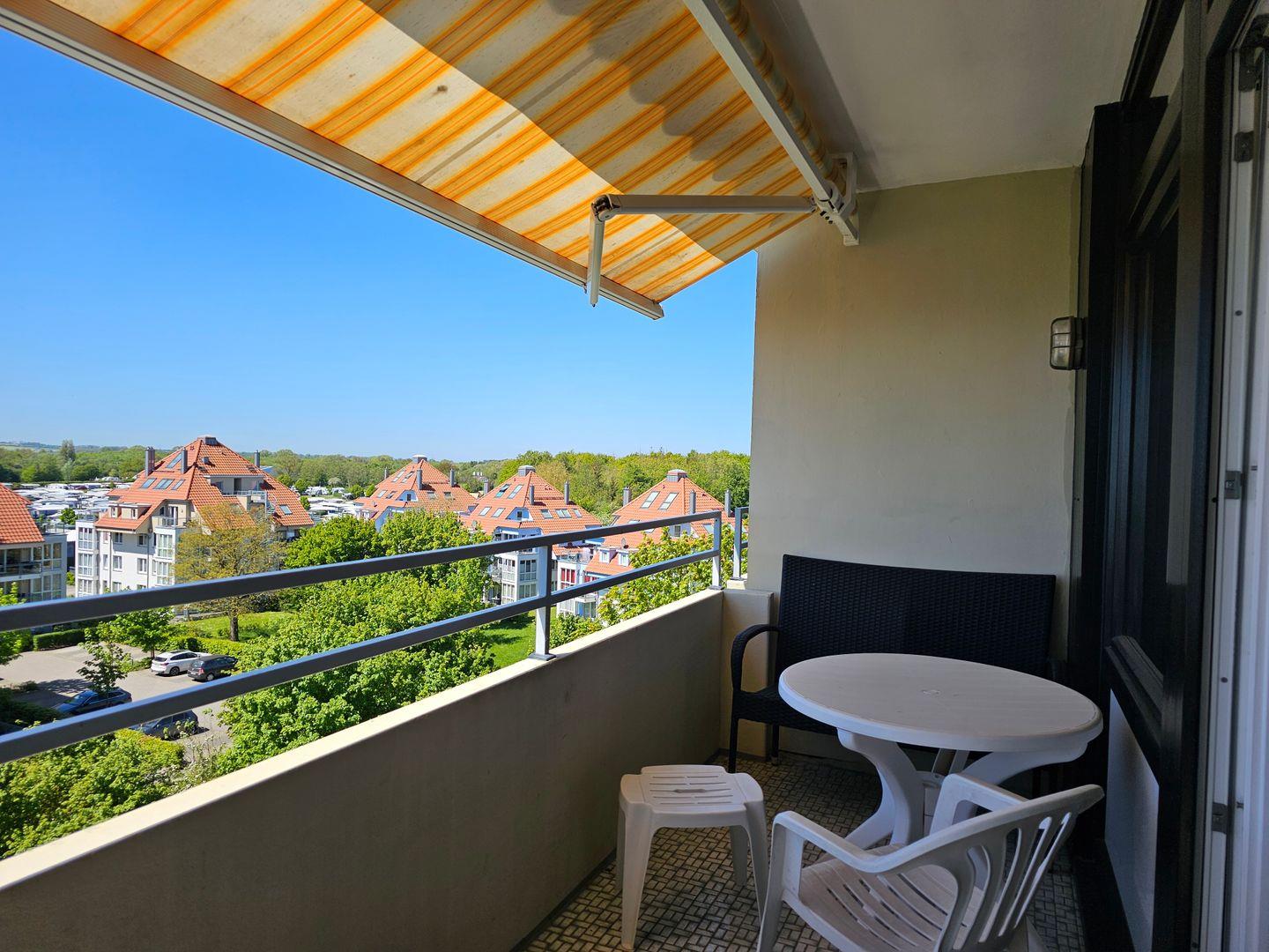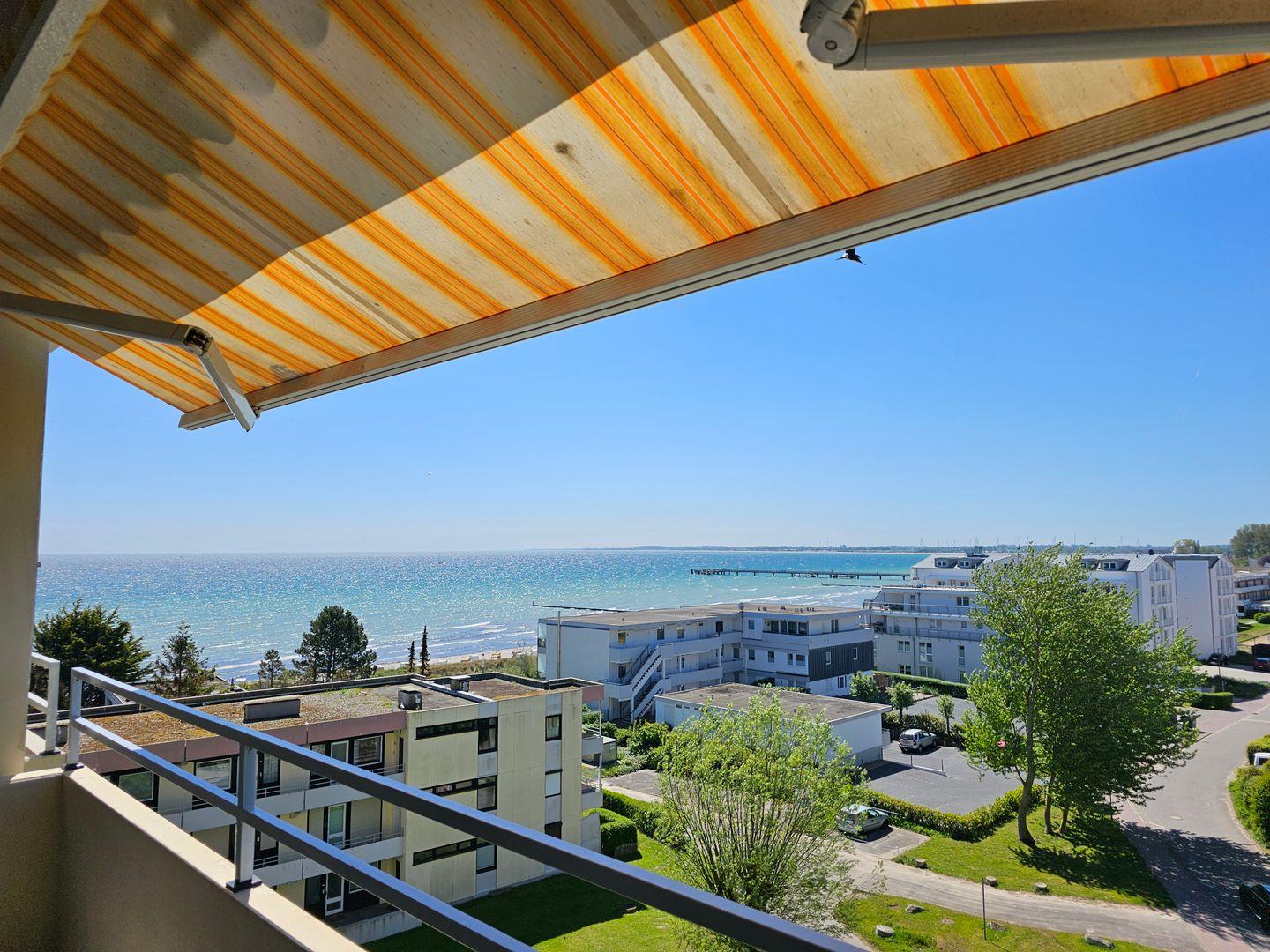 Vom Süd-West ausgerichteten möblierten Balkon mit herrlichem Ausblick über den gesamten Südstrand, die Promenade und das Meer genießen Sie die Sonne von mittags bis abends. Gegen zu viel Sonne werden Sie von einer großen Markise geschützt.