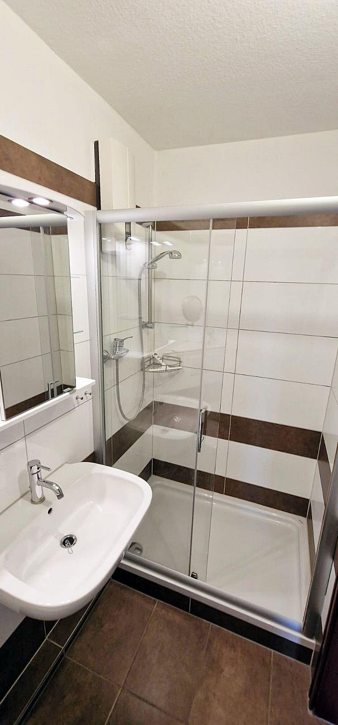 Das moderne Bad verfügt über eine große Dusche mit Glaswänden und niedrigem Einstieg.