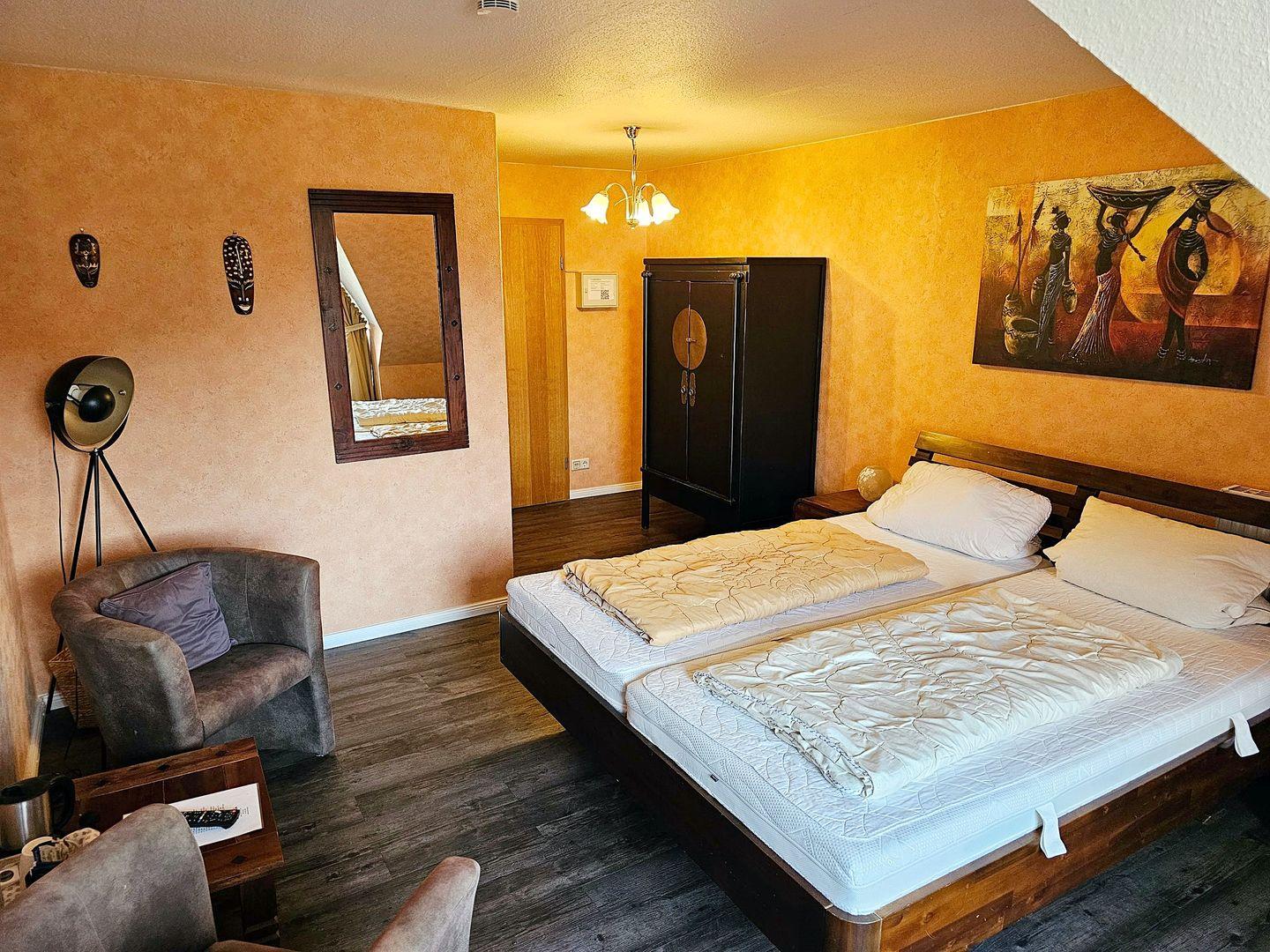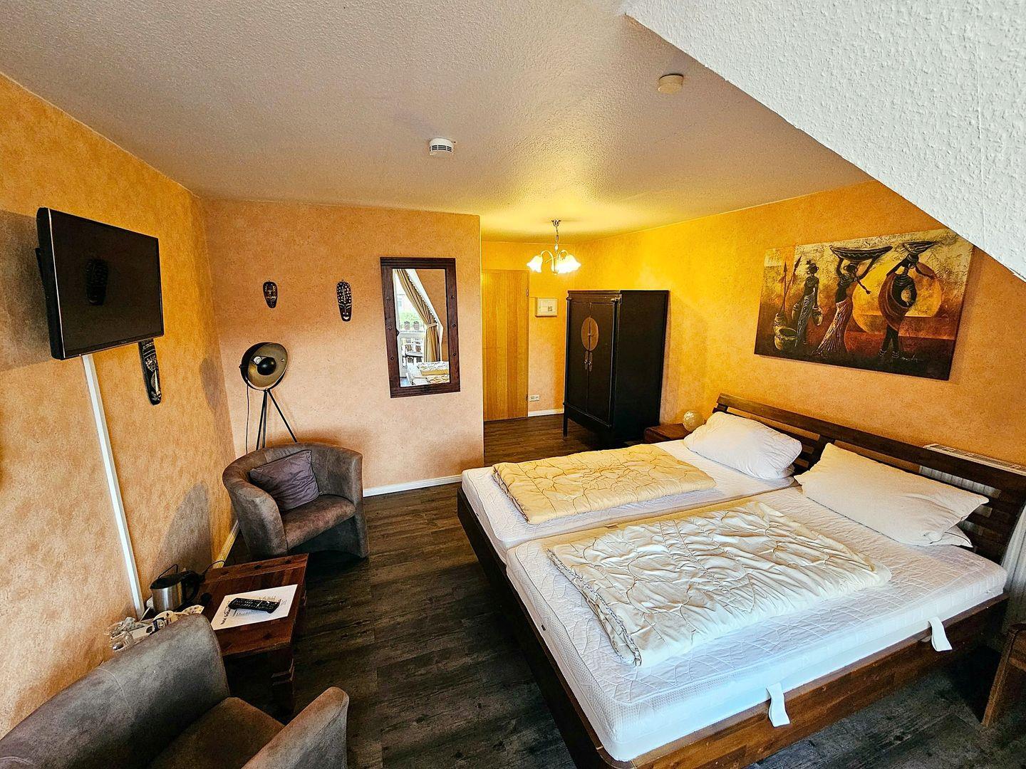 In diesem gemütlich eingerichteten Zimmer befindet sich ein Doppelbett sowie eine kleine Sitzgruppe mit Beistelltisch. Ein großer Kleiderschrank bietet gute Verstaumöglichkeiten für ihre Urlaubsgarderobe und an dem zusätzlichen kleinen Schreibtisch können Sie Ihre weiteren Unternehmungen planen.